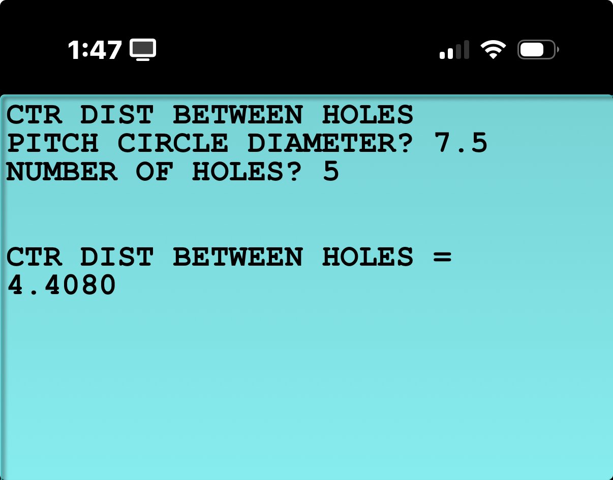 Just enter the Pitch Circle Diameter and the number of holes. The output is the distance between the holes. Use email account on your iPhone, open with GraphNCalc83. You should receive a message "Imported Successfully".