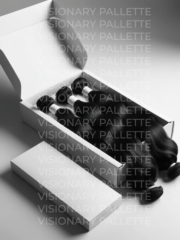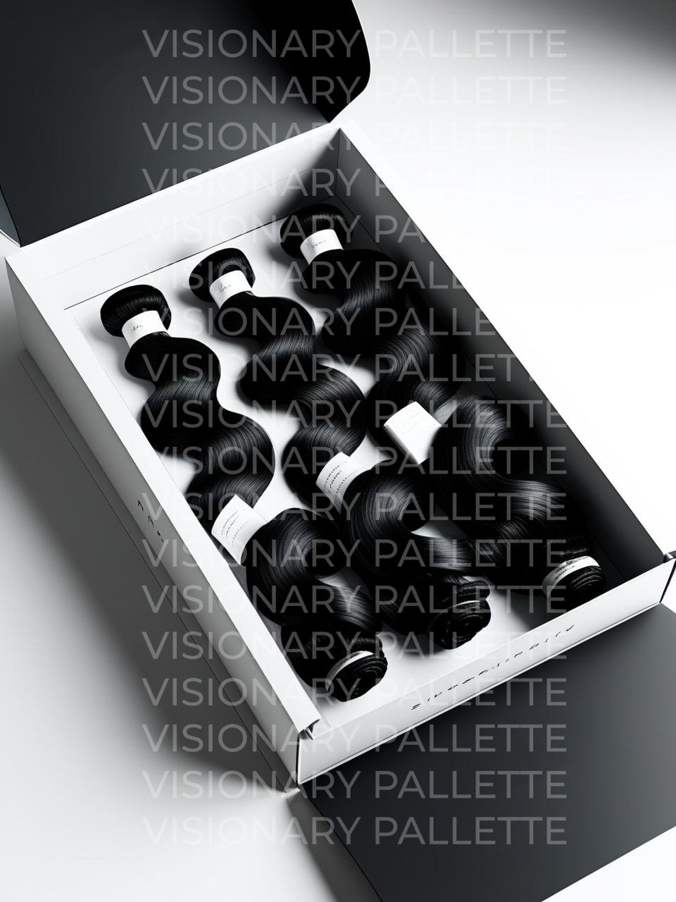 A realistic black and white Open subscription box with realistic black Body Wave hair bundles inside