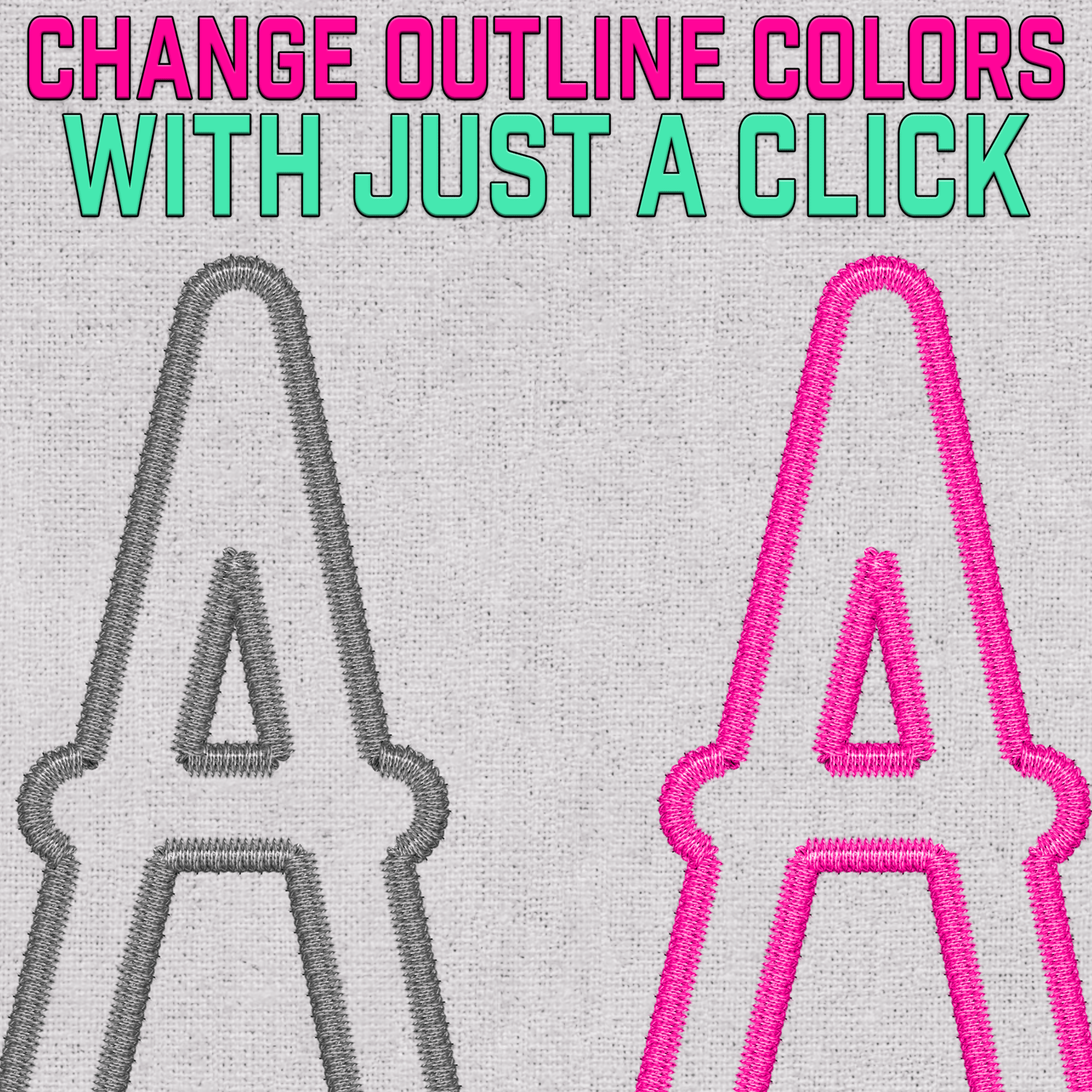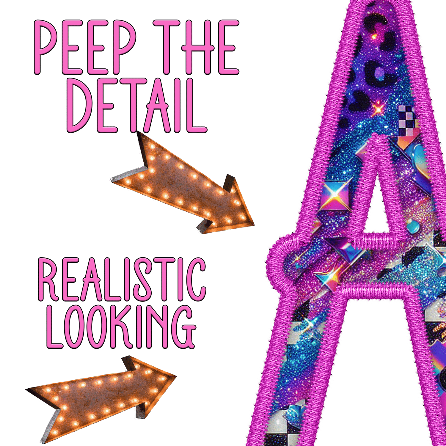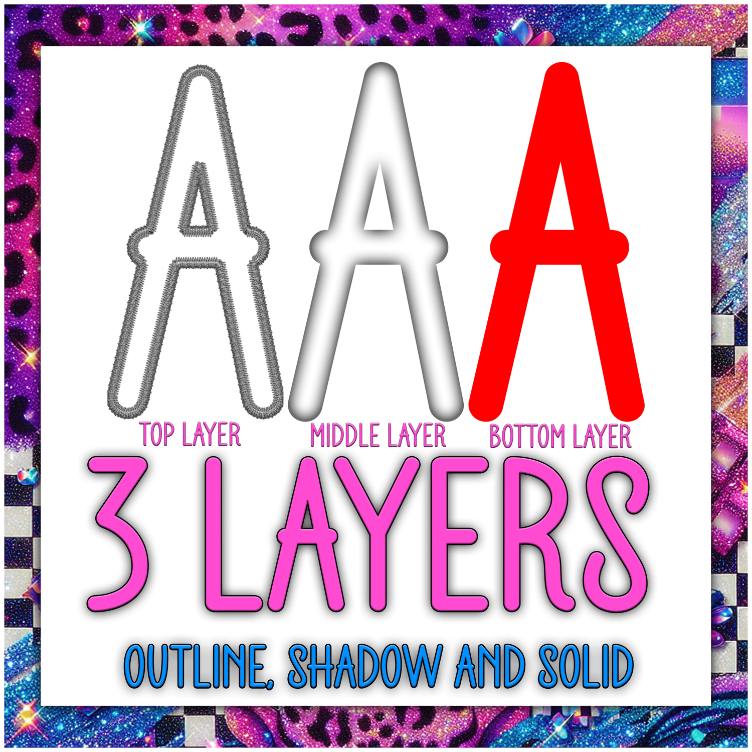 - Full alphabet (A–Z) & numbers (0–9) in faux embroidery outlines, shadows, and solids.