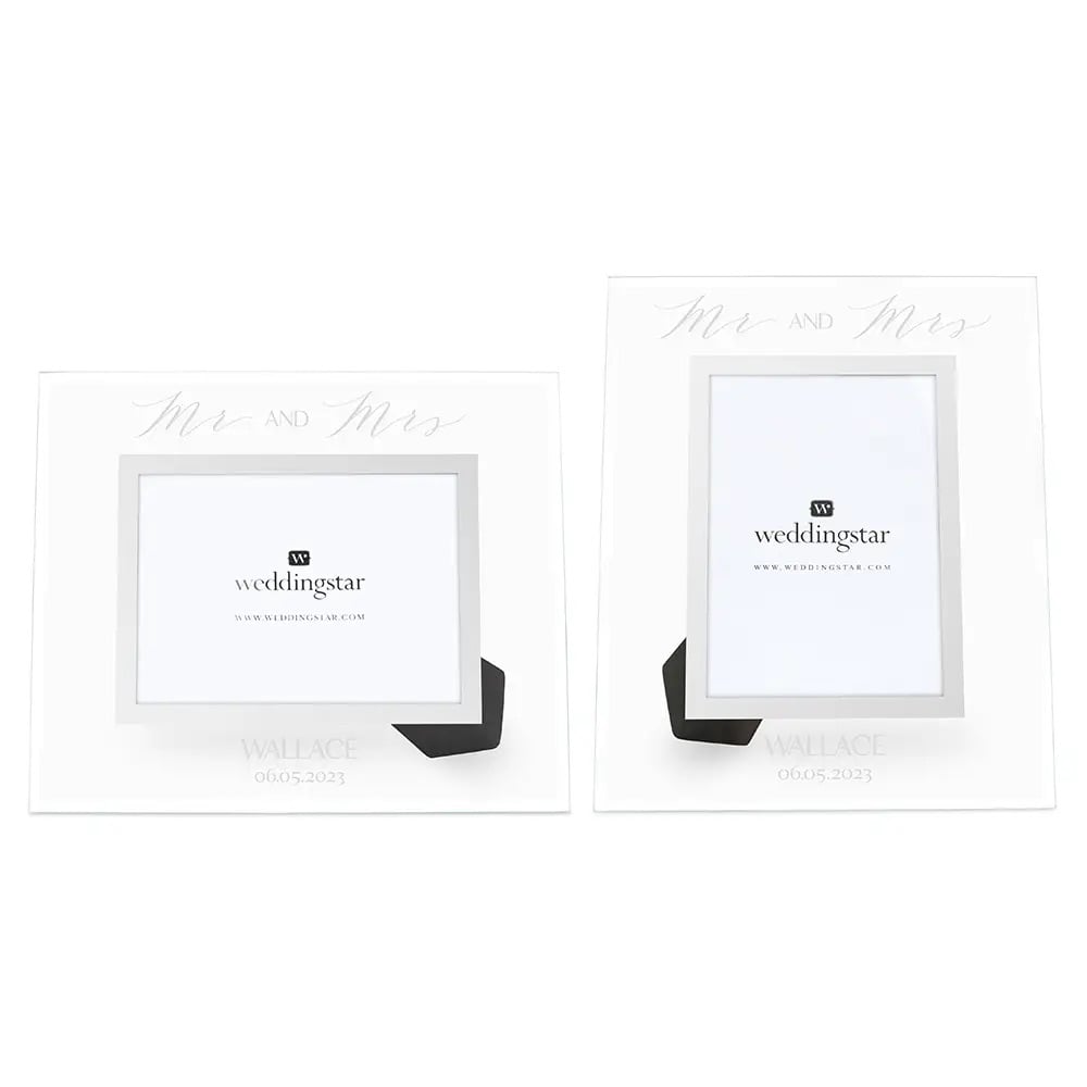 With a wide, bevel-edged glass border as its distinguishing feature, the modern clear glass frame will seamlessly match its surrounding décor, displaying the 5" x 7" photo within. The glass picture frame is easel back only. Perfect for showing off pictures on table surfaces, desks, and mantles. A picture says a thousand words, but you can highlight that perfectly captured moment with a custom engraved "Mr and Mrs" design. Add your family name or pair of names to the modern frame and display the remarkable moment with words unique to the picture.
