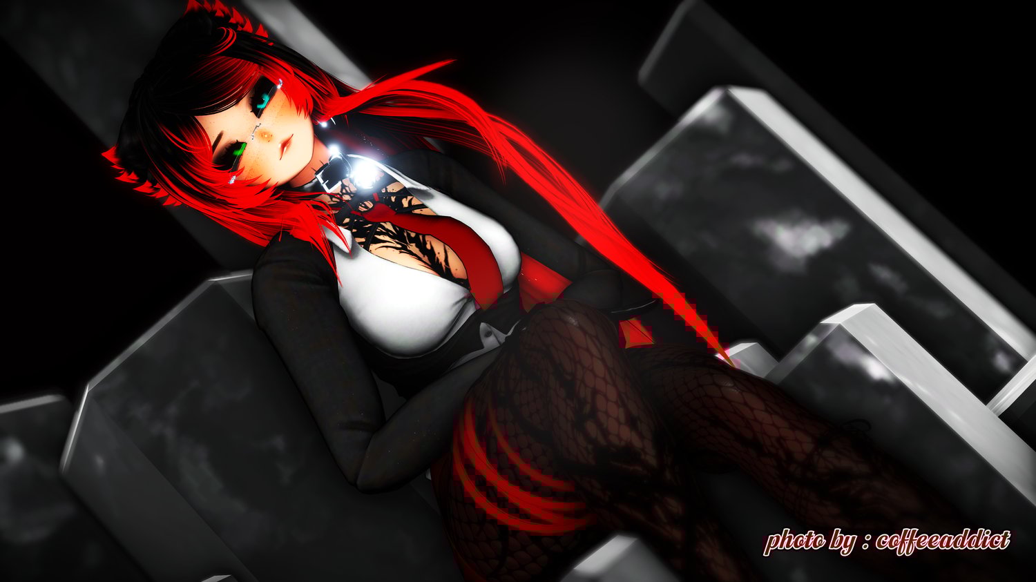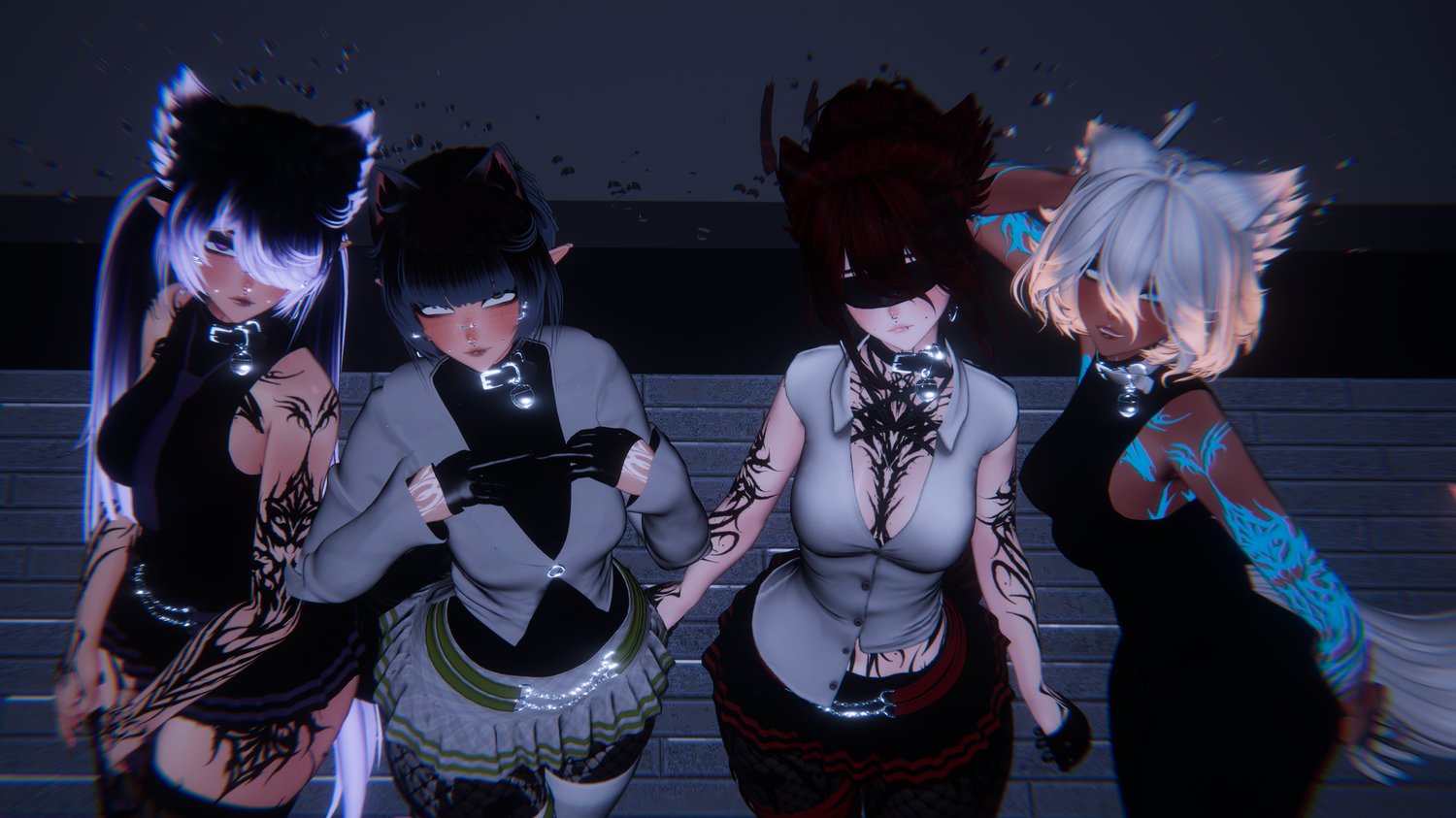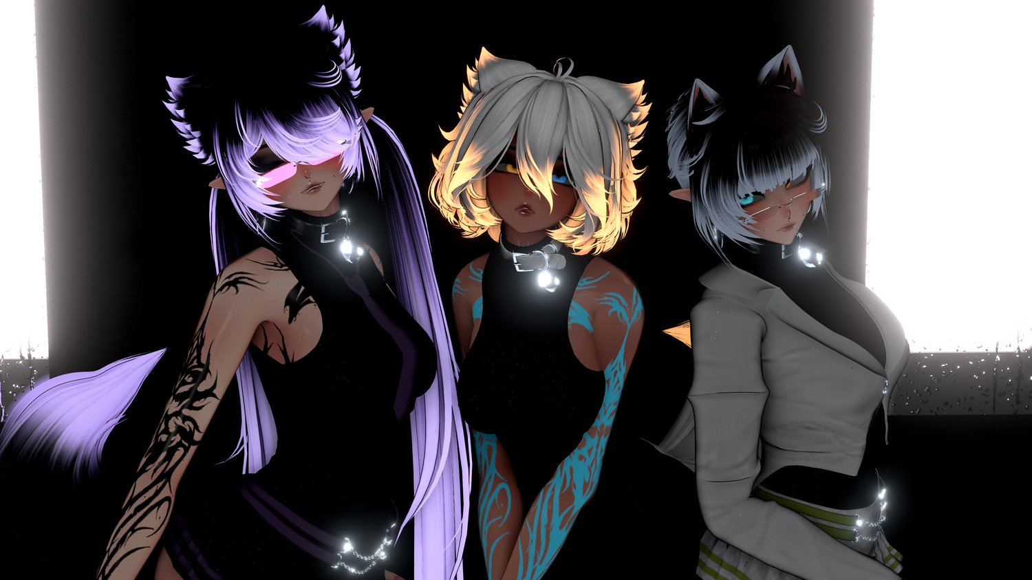 ⟣ left thigh high, right thigh high, socks, leg ribbons, blindfold, collar, rings, glasses, tie, gloves, fishnets, waist wrap, piercings