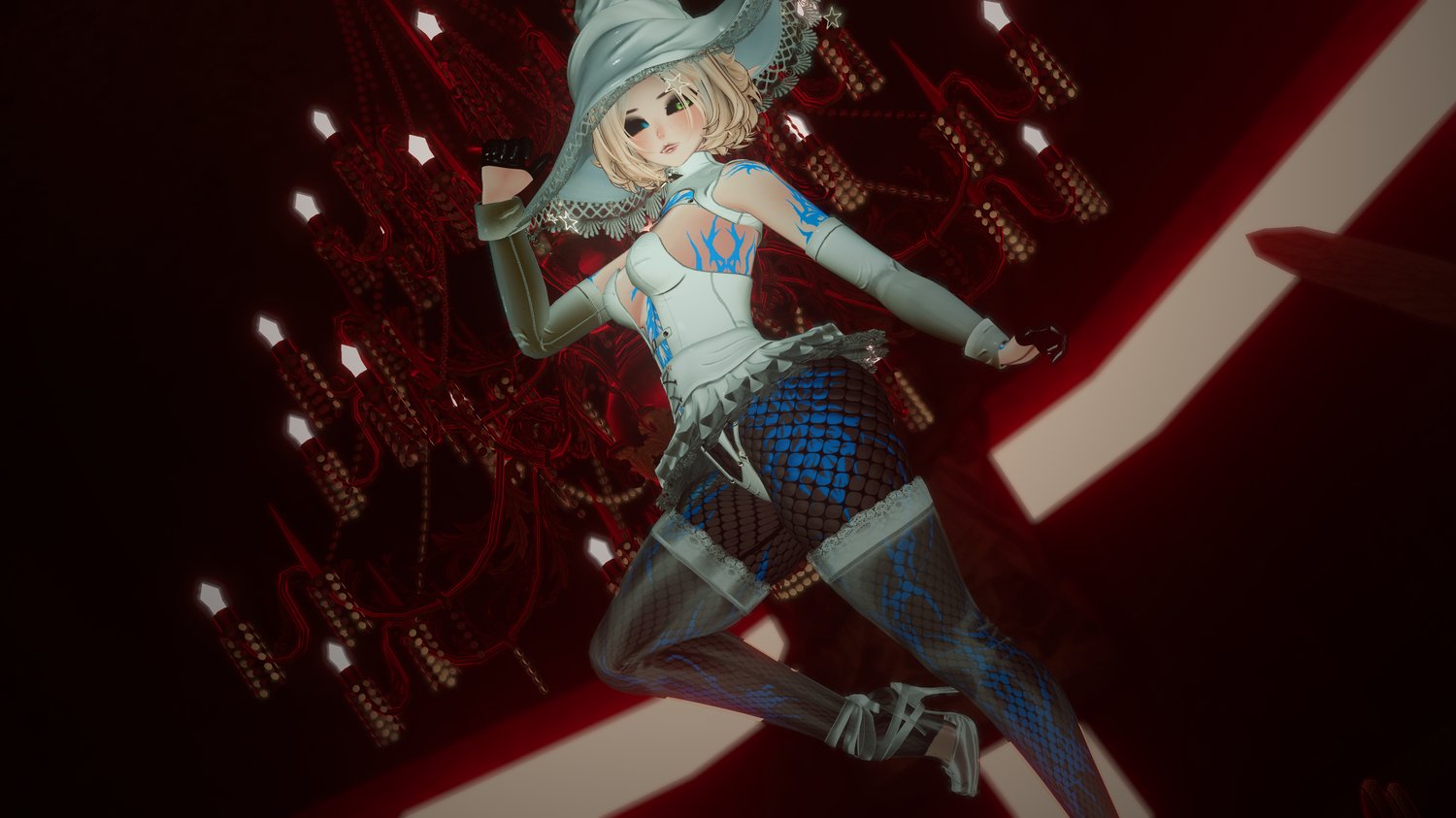 ⟣ bodysuit, sleeves, collar, thigh highs, heels, hat