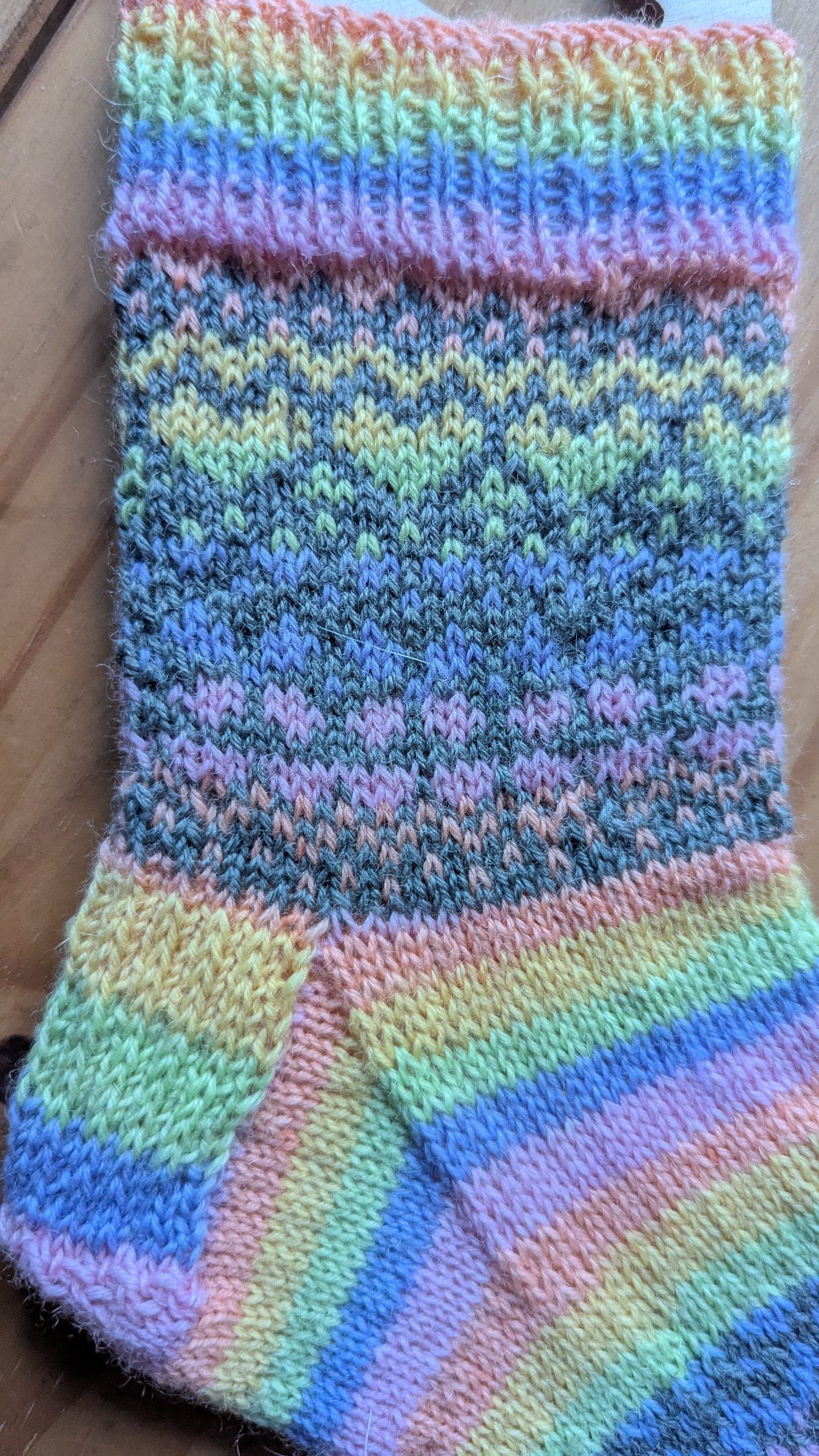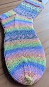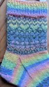 4ply sock yarn, 50g / 200 meters of Yarn A the variegated rainbow and 15g / 60 meters of Yarn B (background colour)