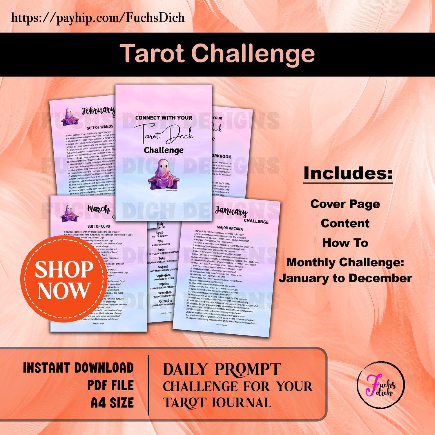 Introducing the "Connect with Your Tarot Deck Challenge" workbook! This engaging resource is designed to deepen your relationship with tarot through daily prompts and monthly themes, covering all 78 cards. Each day invites you to reflect, journal, and explore different aspects of your deck, fostering a deeper understanding of its meanings and your personal intuition. Whether you're a beginner or an experienced reader, this workbook offers a structured yet flexible approach to enhance your tarot practice throughout the year. Start your journey of self-discovery and connection today! One question for each day!