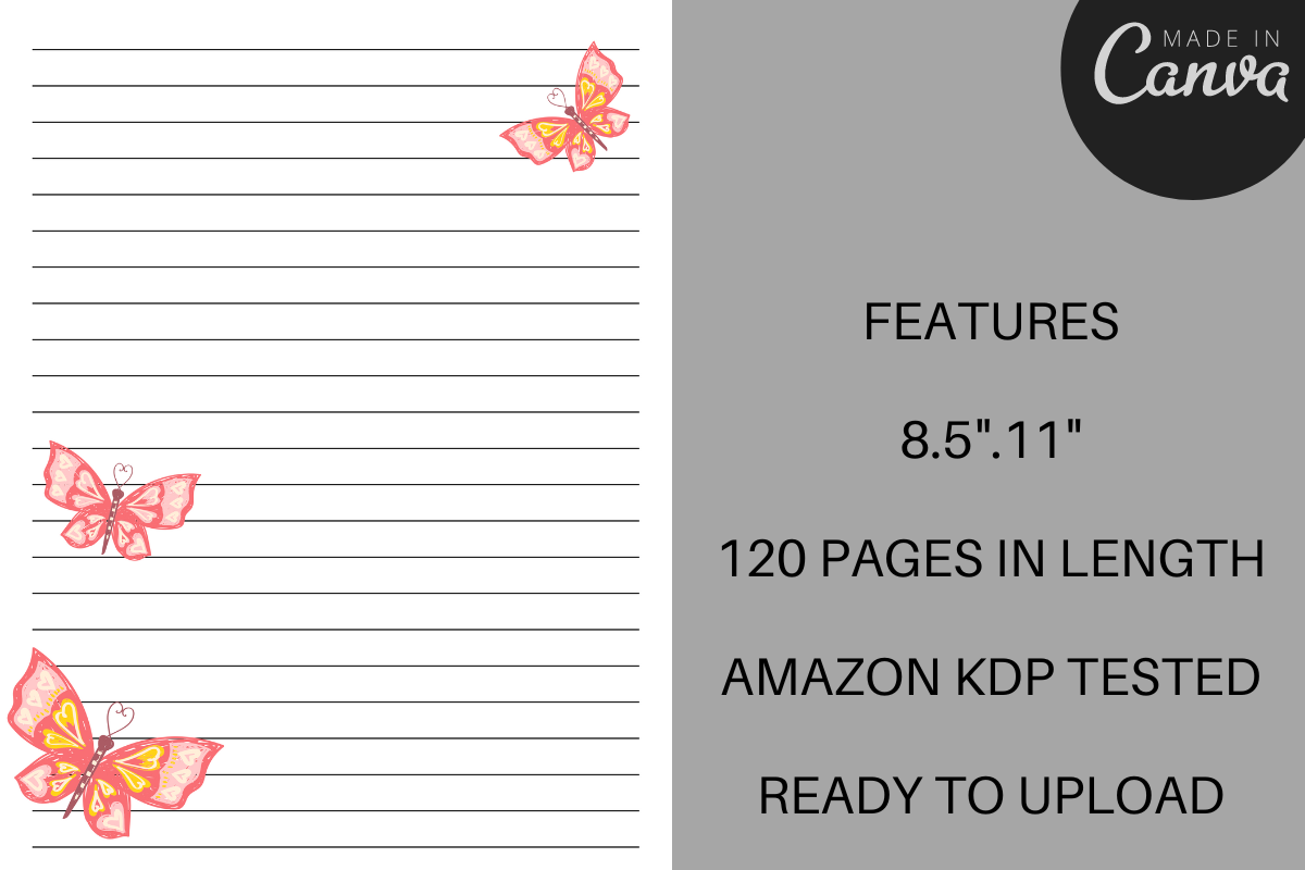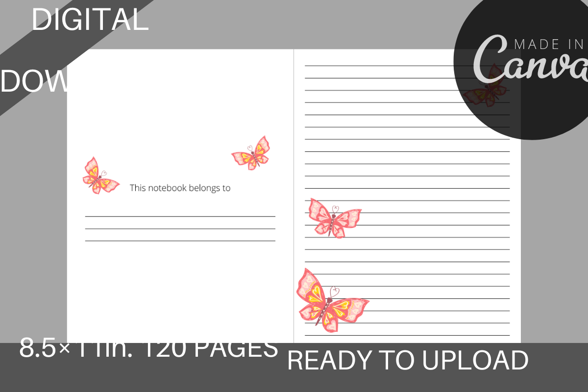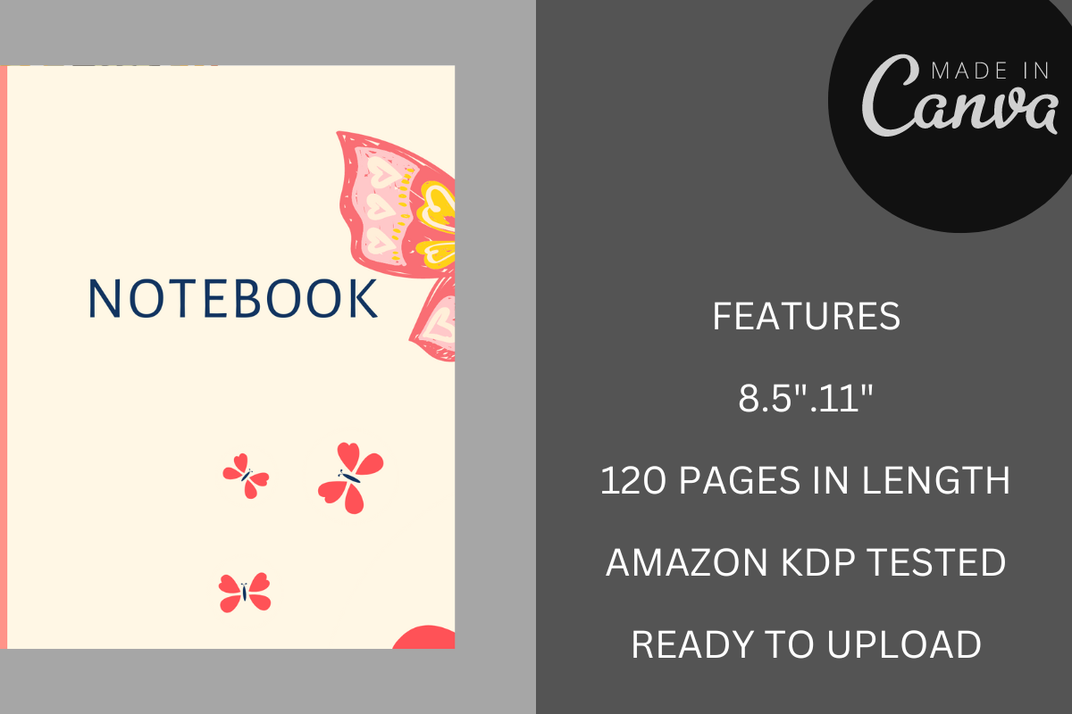 INTERIOR+COVER FOR BUTTERFLY THEMED KDP LINED PAPER, LOW CONTENT BOOK FOR KDP READY UPLOAD, KDP JOURNAL PAPER, JOURNAL NOTEBOOK MOCKUPS, KDP CANVA NOTE