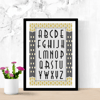 A counted cross stitch pattern featuring an alphabet of Art Deco style letters framed by an Art Deco geometric border in black and gold.