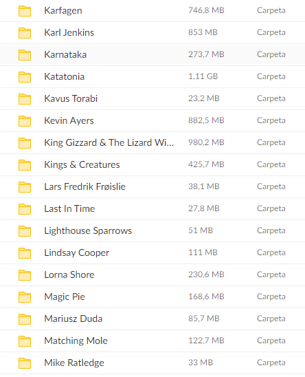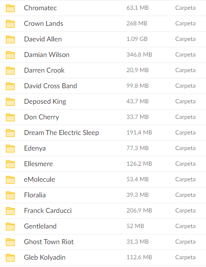 Este producto consiste en el enlace directo a una carpeta en la que encontraras 796 carpetas con 6770 canciones de agrupaciones rock progresivo actual, en formato ligero *.ogg, reproducible en cualquier reproductor actual, las cuales podrás descargar en el momento y en el modo que desees.