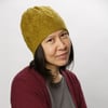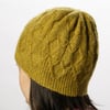 The hat is worked in the round from the bottom up, starting with a twisted rib brim. Pattern includes both charted and written instructions. Techniques required: knitting in the round, twisted rib, cables, decreases.