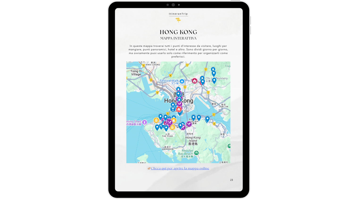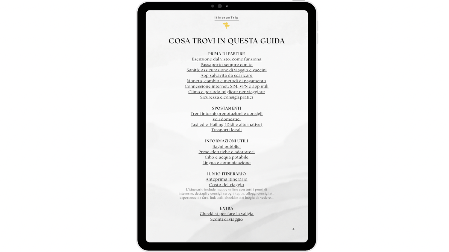 Troverai informazioni pratiche, itinerari giorno per giorno, mappe interattive, suggerimenti e link diretti per prenotare alloggi ed esperienze, quale budget prevedere, checklist per fare la valigia e sconti di viaggio.
