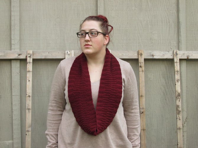 The scarf is fully reversible, making it easy to wear, and allows you to get the most out of one or two truly lovely skeins of DK-weight yarn.