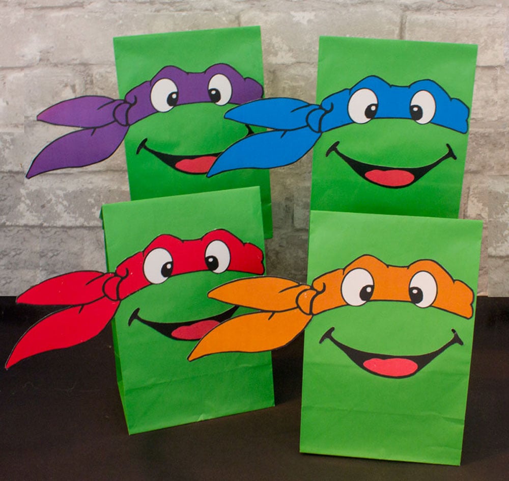 If you're hosting a "Teenage Mutant Ninja Turtles" themed party and want to create cute TMNT Face Favor Bags like ours, you'll need these printables to transform your green gift bags into something totally rad!