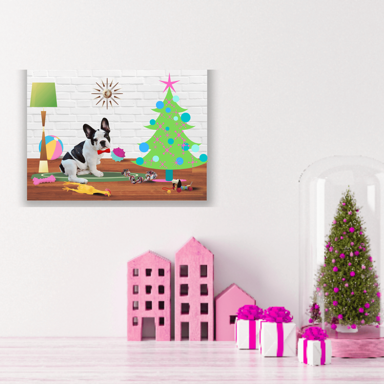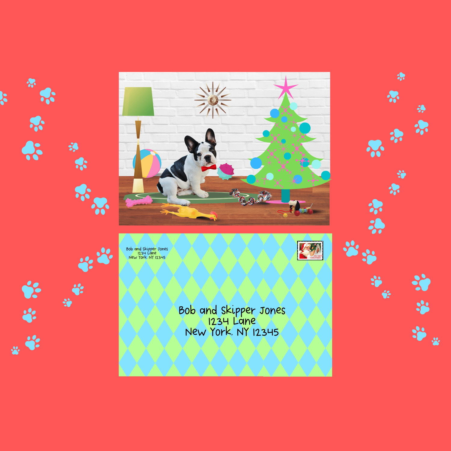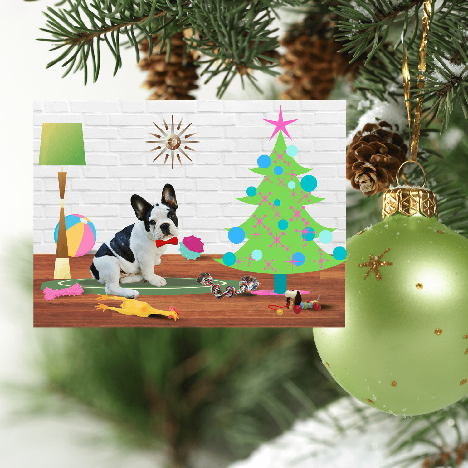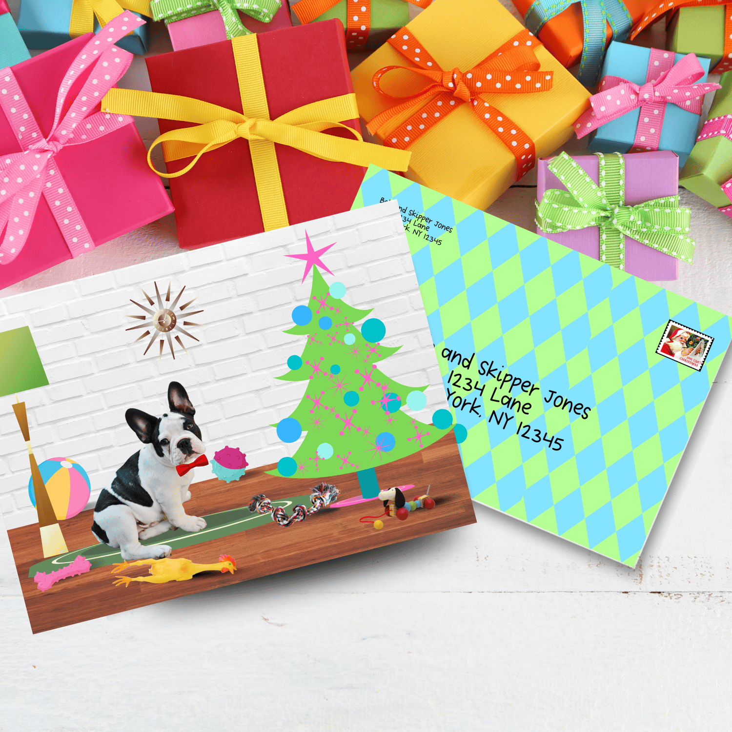 Christmas Holiday Card! Retro/midcentury modern design with French Bulldog! Instant download w/ unlimited uses! Envelope template included.