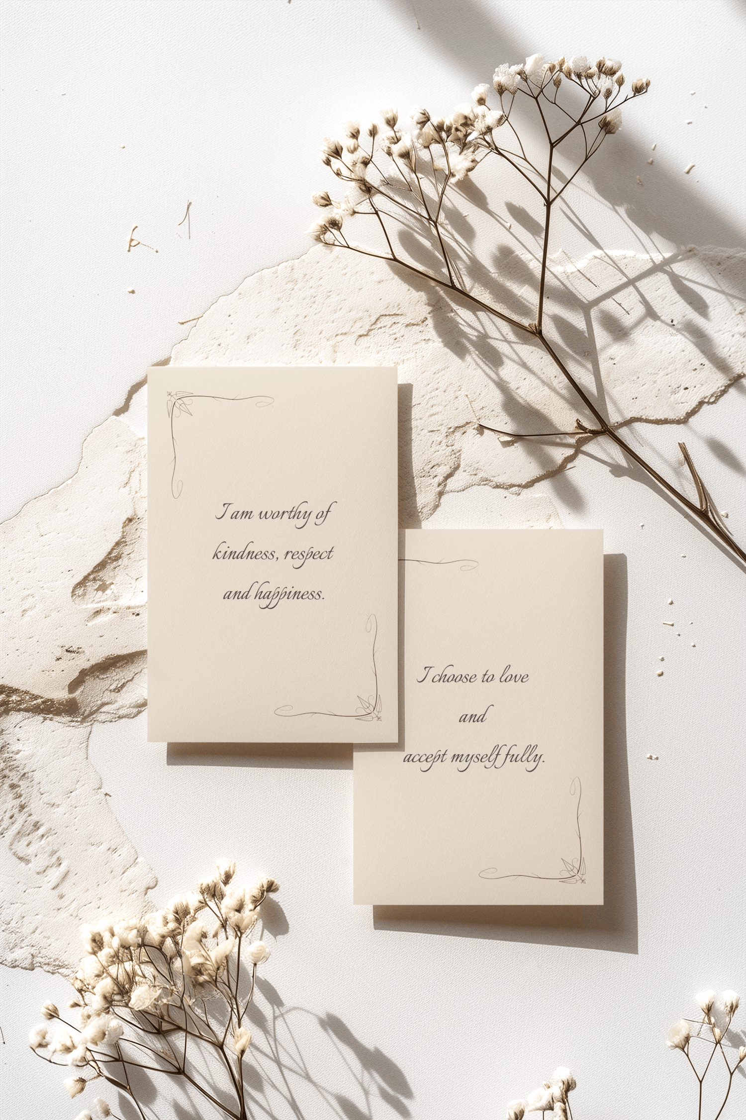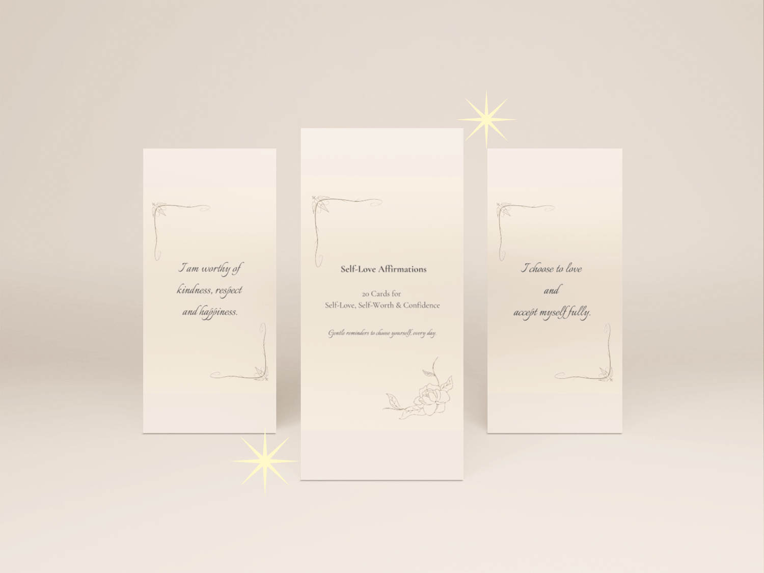 This set of 20 self-love affirmation cards is designed to gently support self-worth, confidence, and inner calm. Each affirmation helps you reconnect with yourself, release self-doubt, and create intentional moments of self-care in your daily routine.