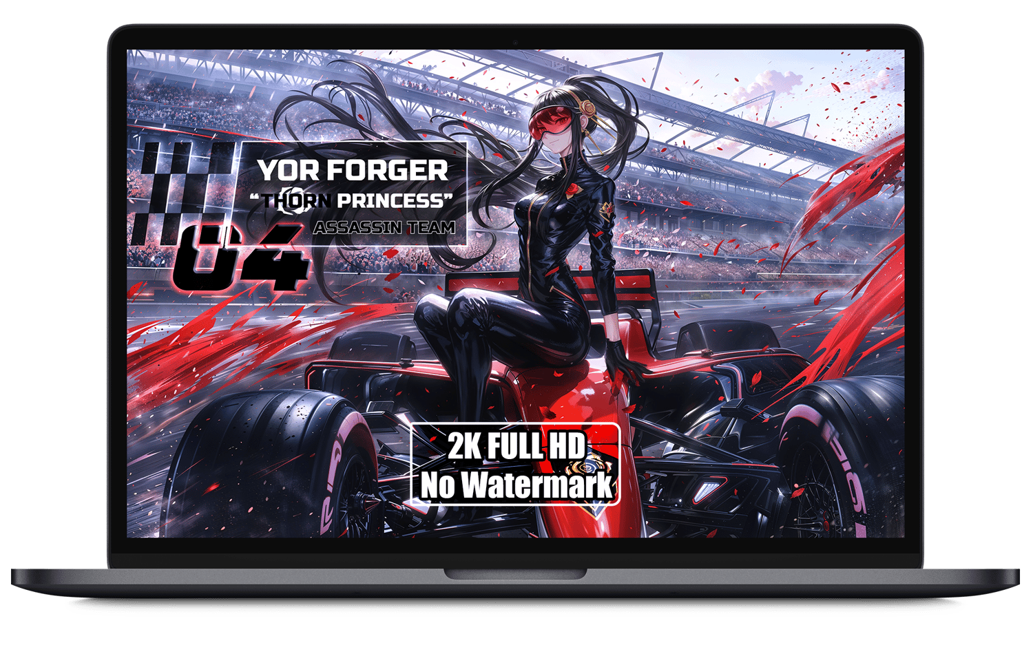 The Thorn Princess trades daggers for drift. Calm, deadly, and dressed in black leather — Yor rules the circuit with silent precision and crimson grace.