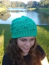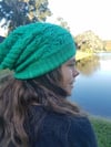 Farica is a counterpane hat. It starts with a lace counterpane worked in the round, with knit/purl welting to make this adorable slouchy hat. Stitches are picked up for the ribbing and the crown and poof! Beautiful hat! This fun construction will make sure you aren't bored with just another hat.
