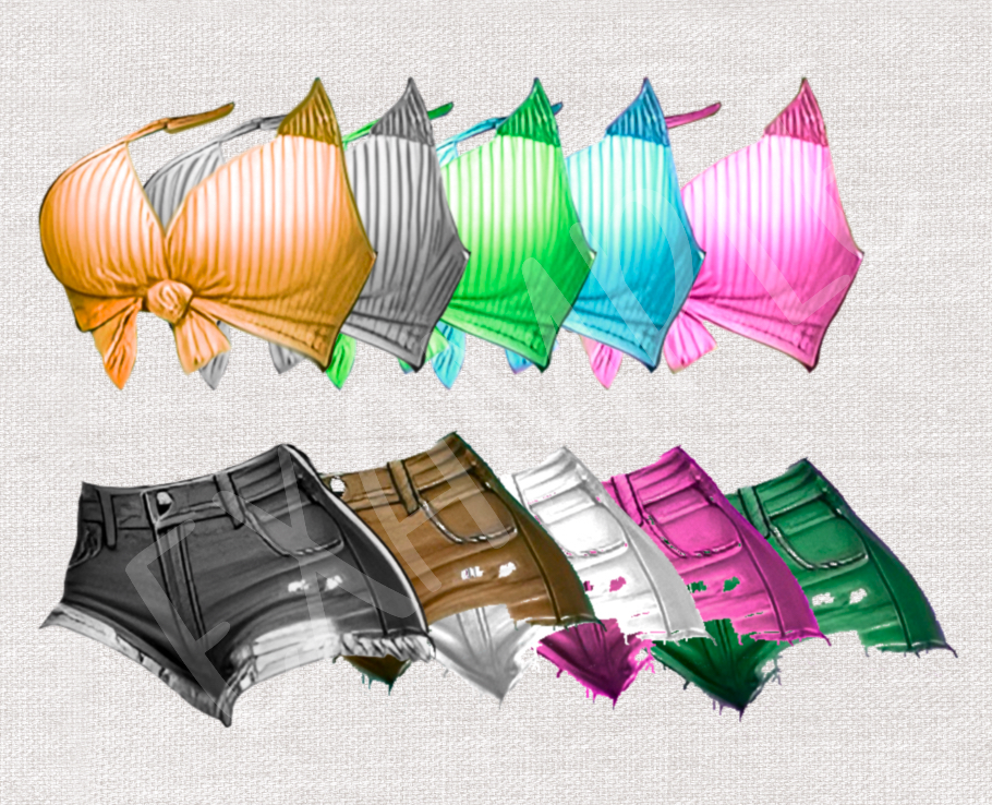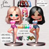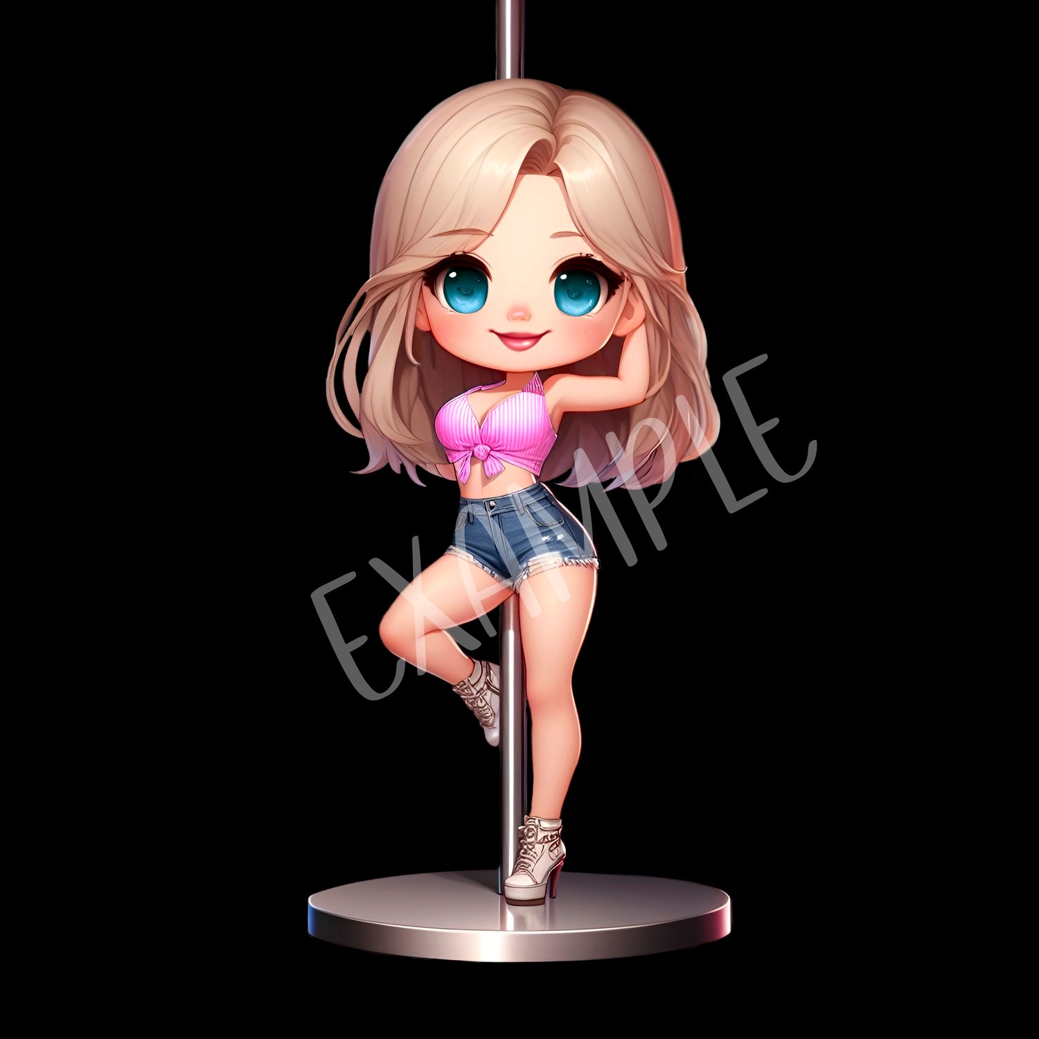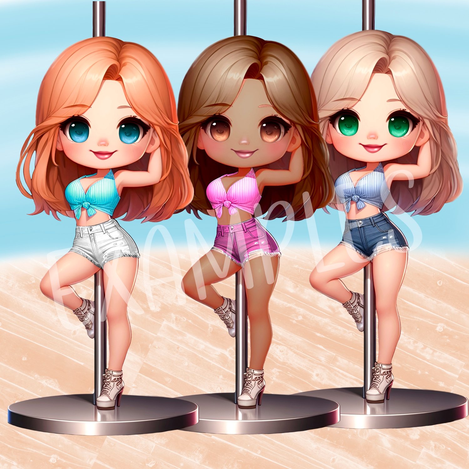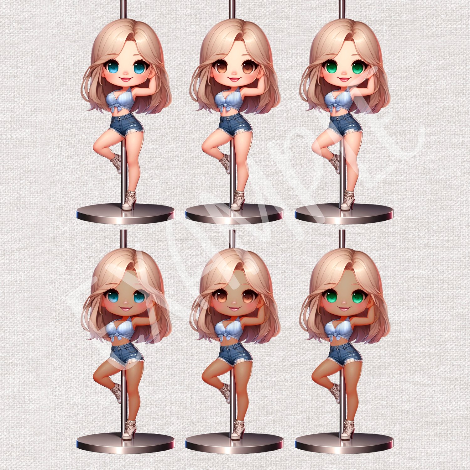 Beautiful pole dancing chibi doll dancer. Choice of eye and skin colours with additional hair, shorts and top clipart. Sublimation, print.