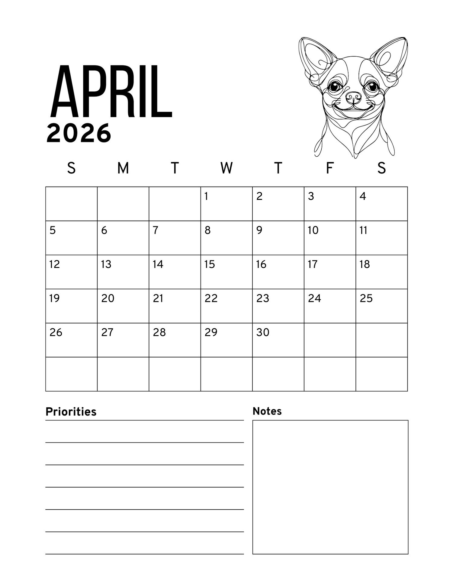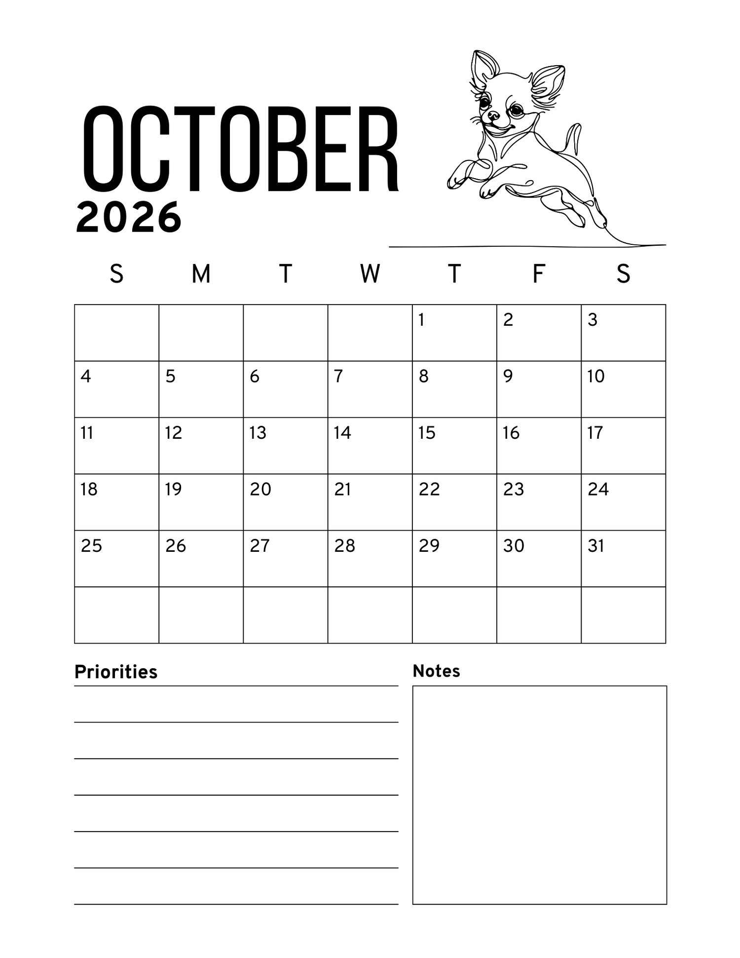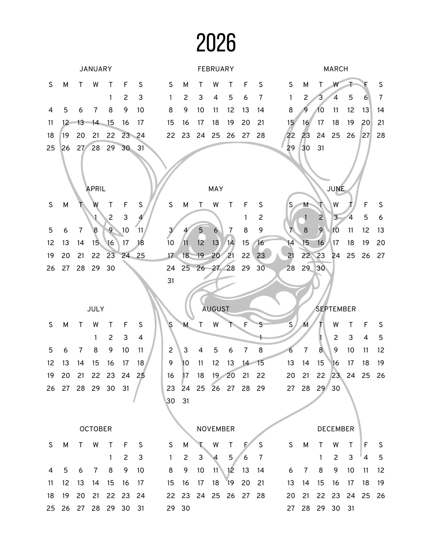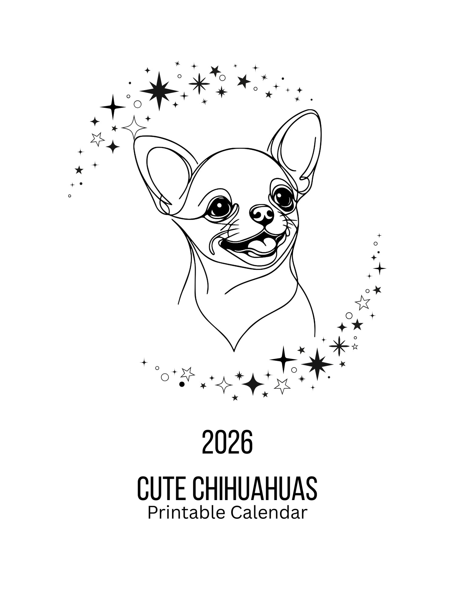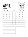 Start the new year with the grace, beauty, and personality of the Chihuahua! This 2026 printable calendar brings the beloved Chihuahua breed to life month after month. Enjoy stunning Chihuahua-themed artwork throughout the year, or gift it to a friend who adores this loyal and elegant breed. Simply download, print, and enjoy a full year of Chihuahua joy.