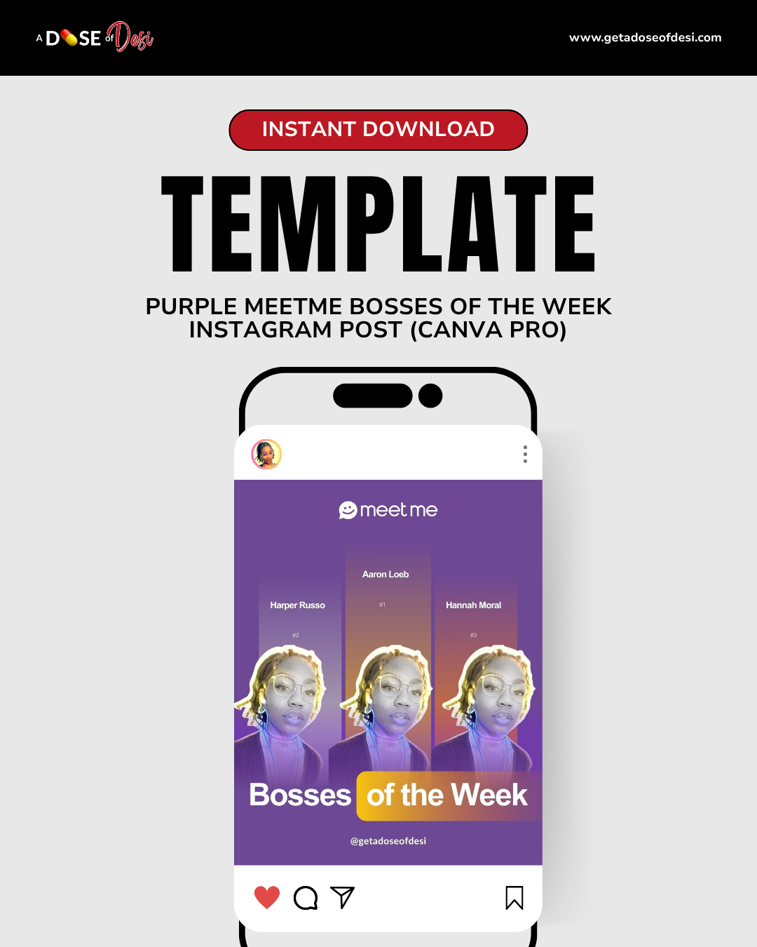 Share your MeetMe Bosses of the Week on Instagram with this eye-catching, editable Canva Instagram template. Perfect for streamers who want to shout out their supporters in style—no design skills needed!