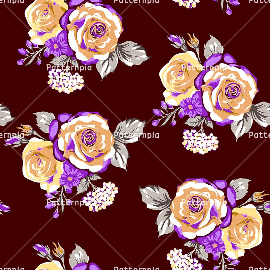 Cream, peach & purple roses with gray leaves on deep maroon base