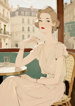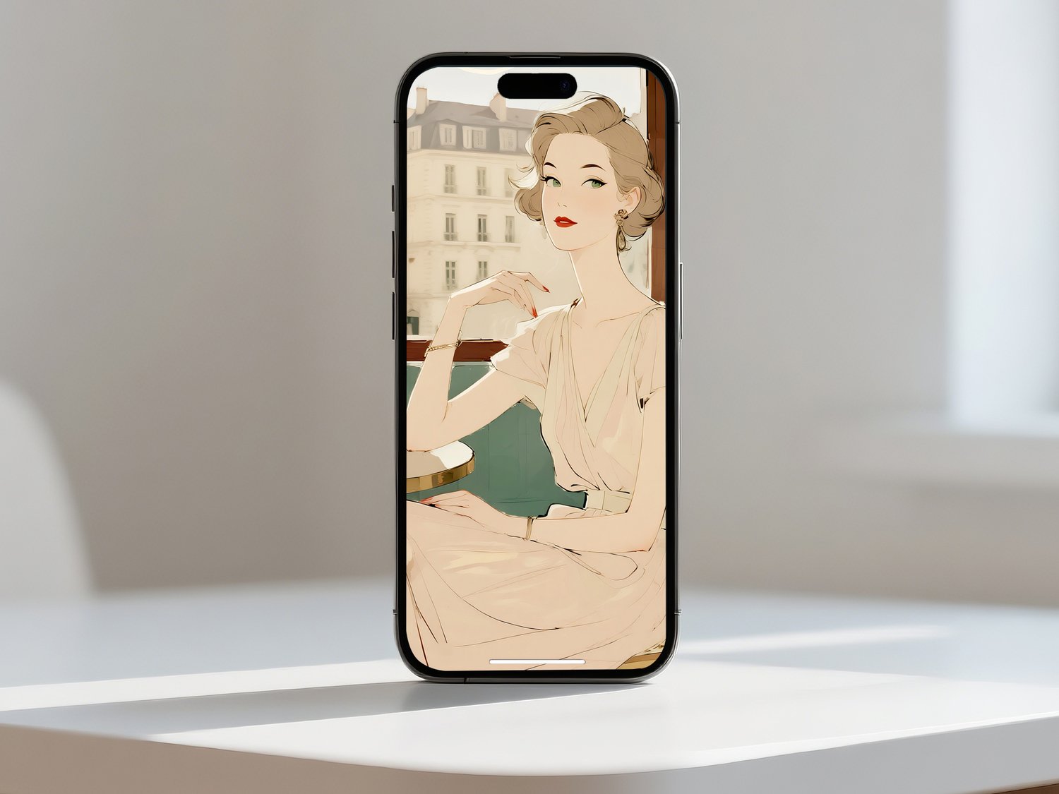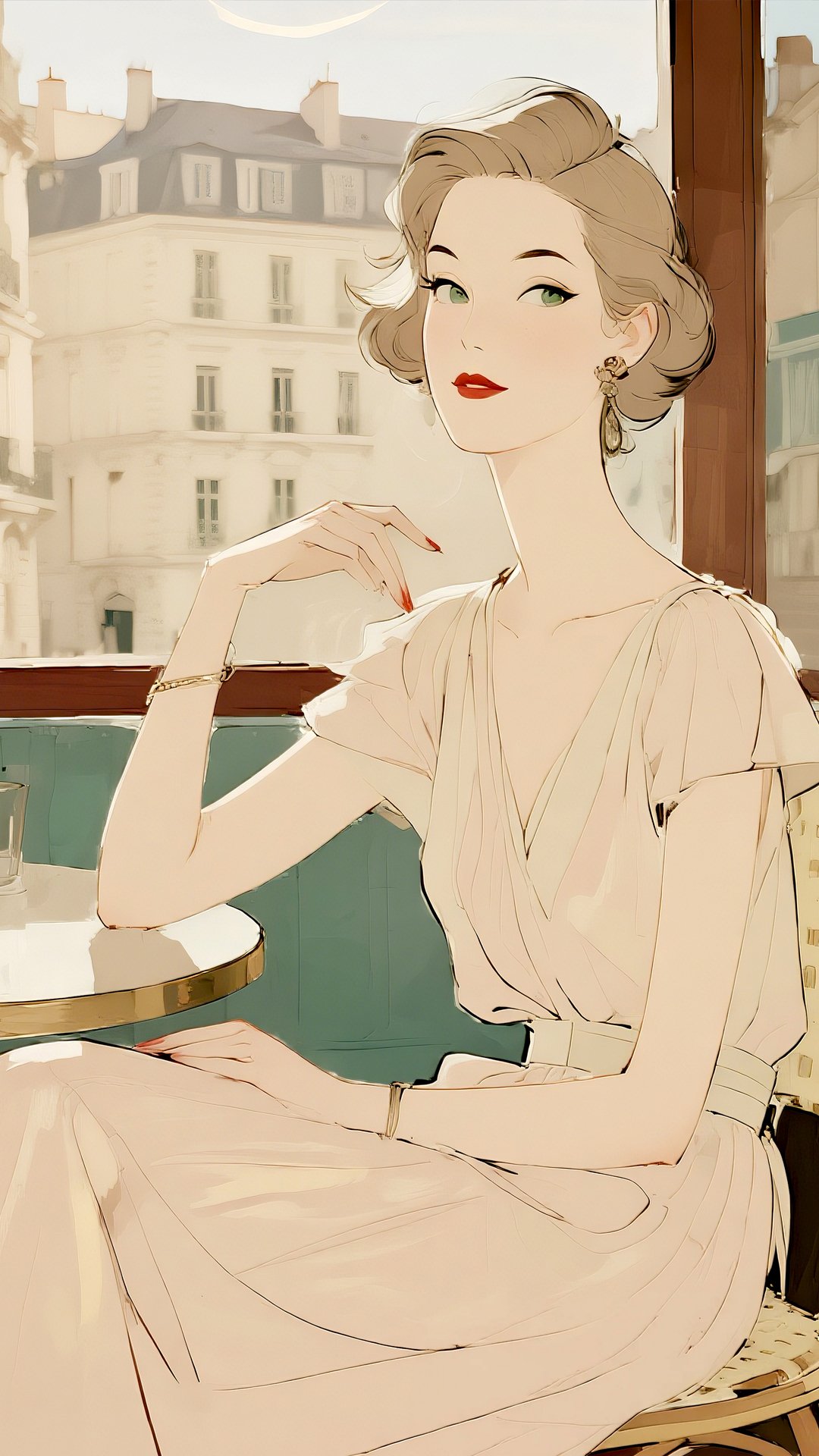 The work depicts a scene of an elegant woman sitting in a café against the backdrop of a European street, and it has a sophisticated atmosphere almost like a fashion illustration. The whole item is based on beige and soft tones, and the red lips and nails of women stand out as accents. This item combines elegance and gorgeousness in a calm color. The streetscape outside the window gives depth as a background and emphasizes the presence of women more. The subject naturally draws your gaze.
