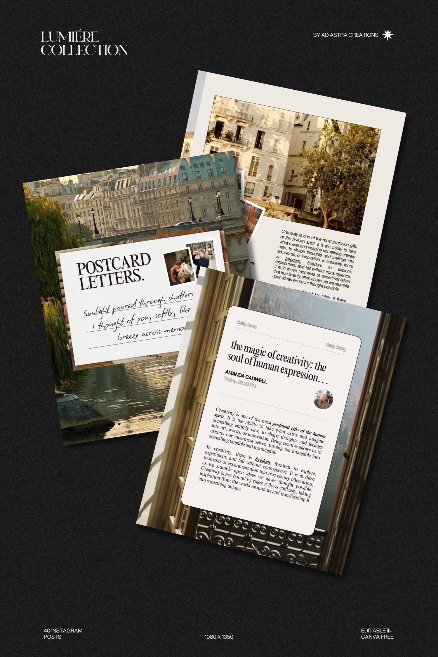 A collection of 40 Instagram templates carefully designed for those seeking an elegant, editorial, and visually inspiring feed. Perfect for sharing thoughts, personal photographs, or reflections in style.