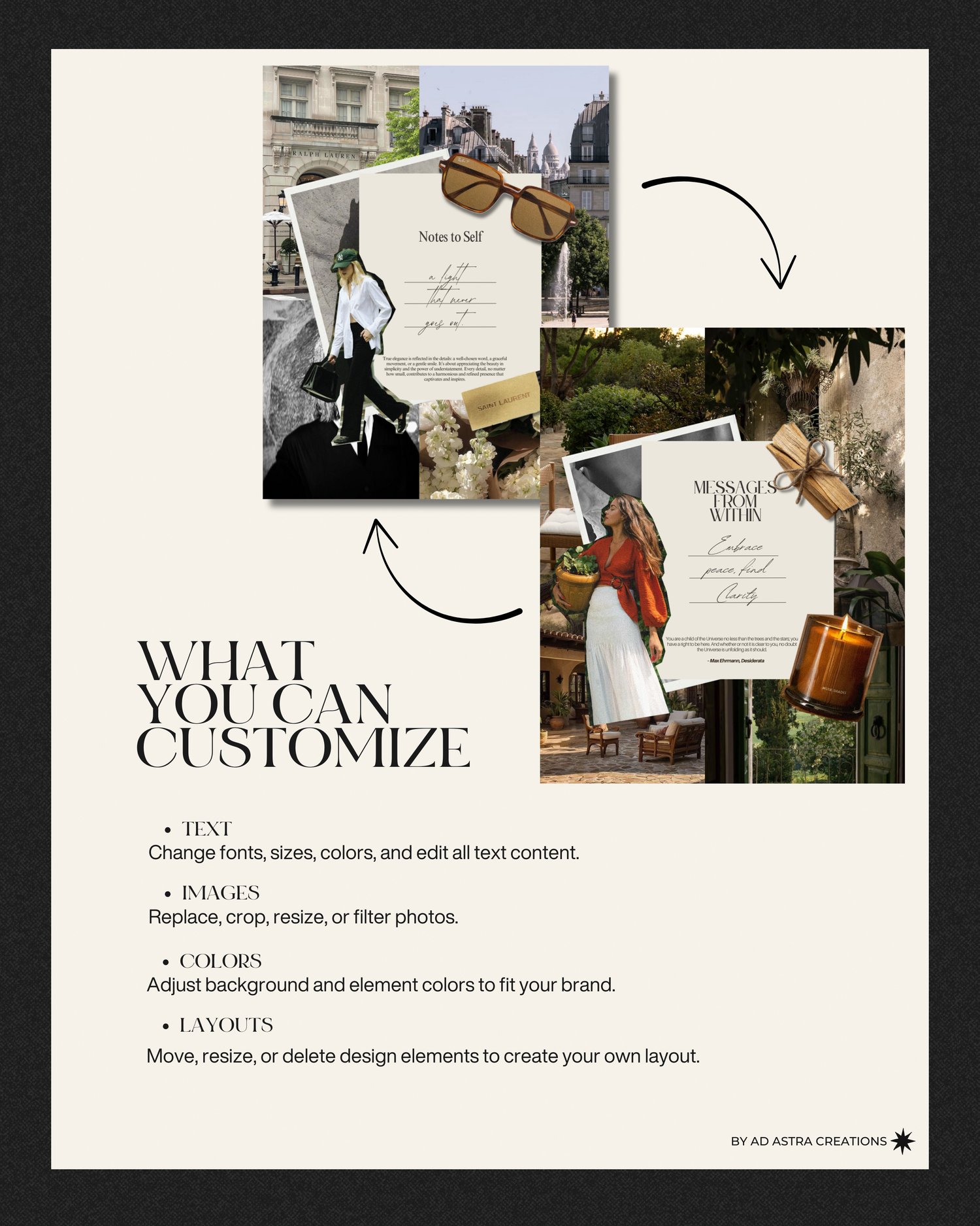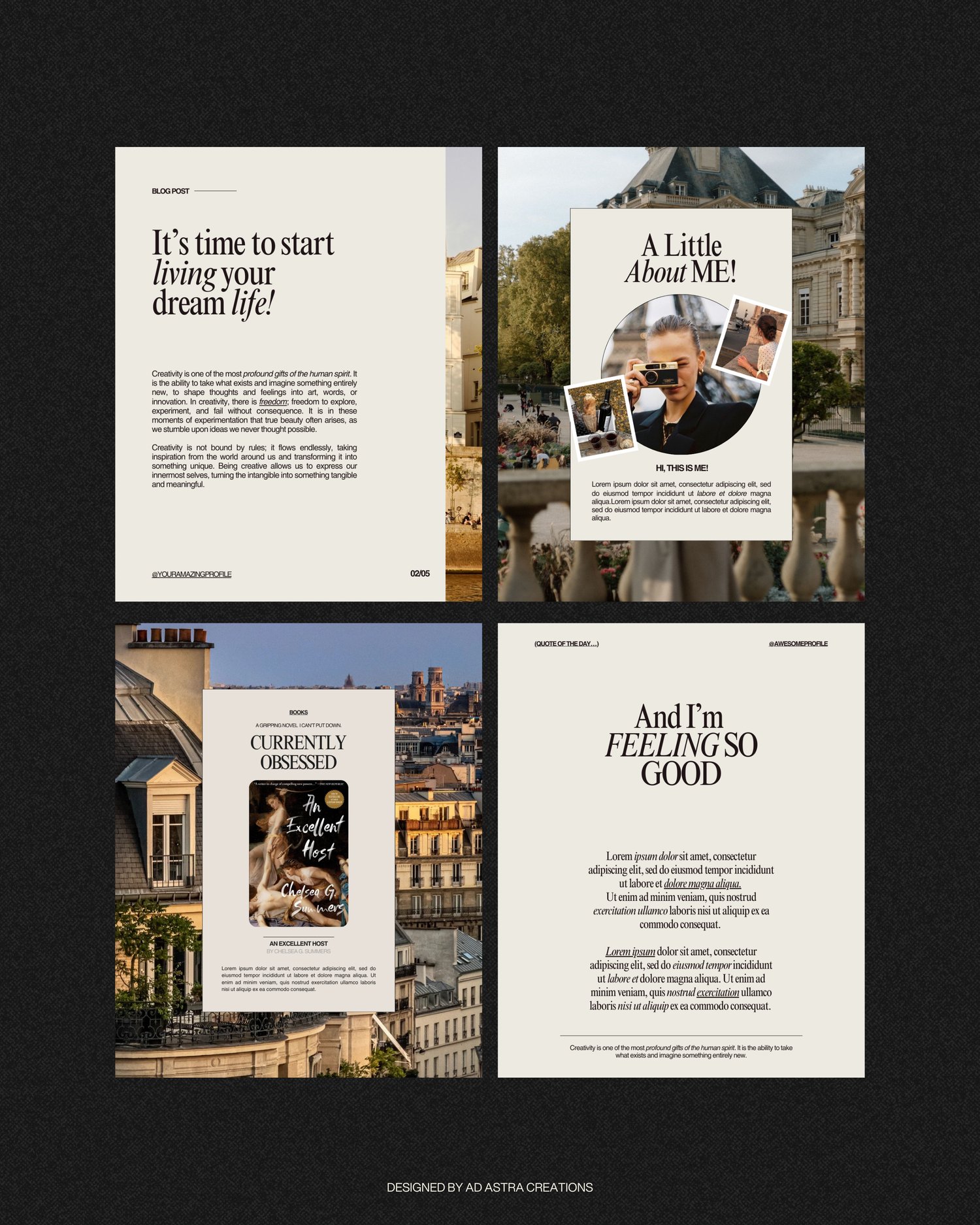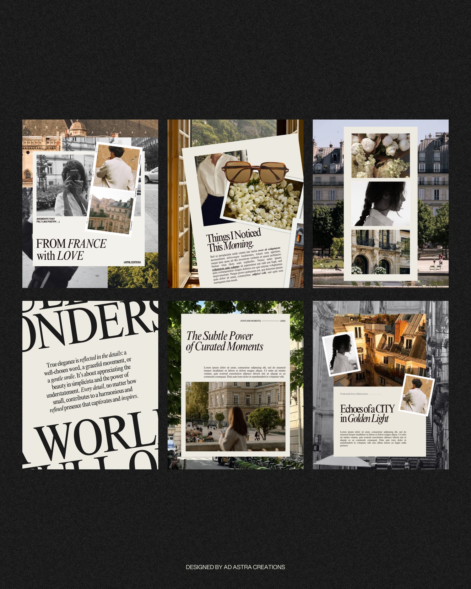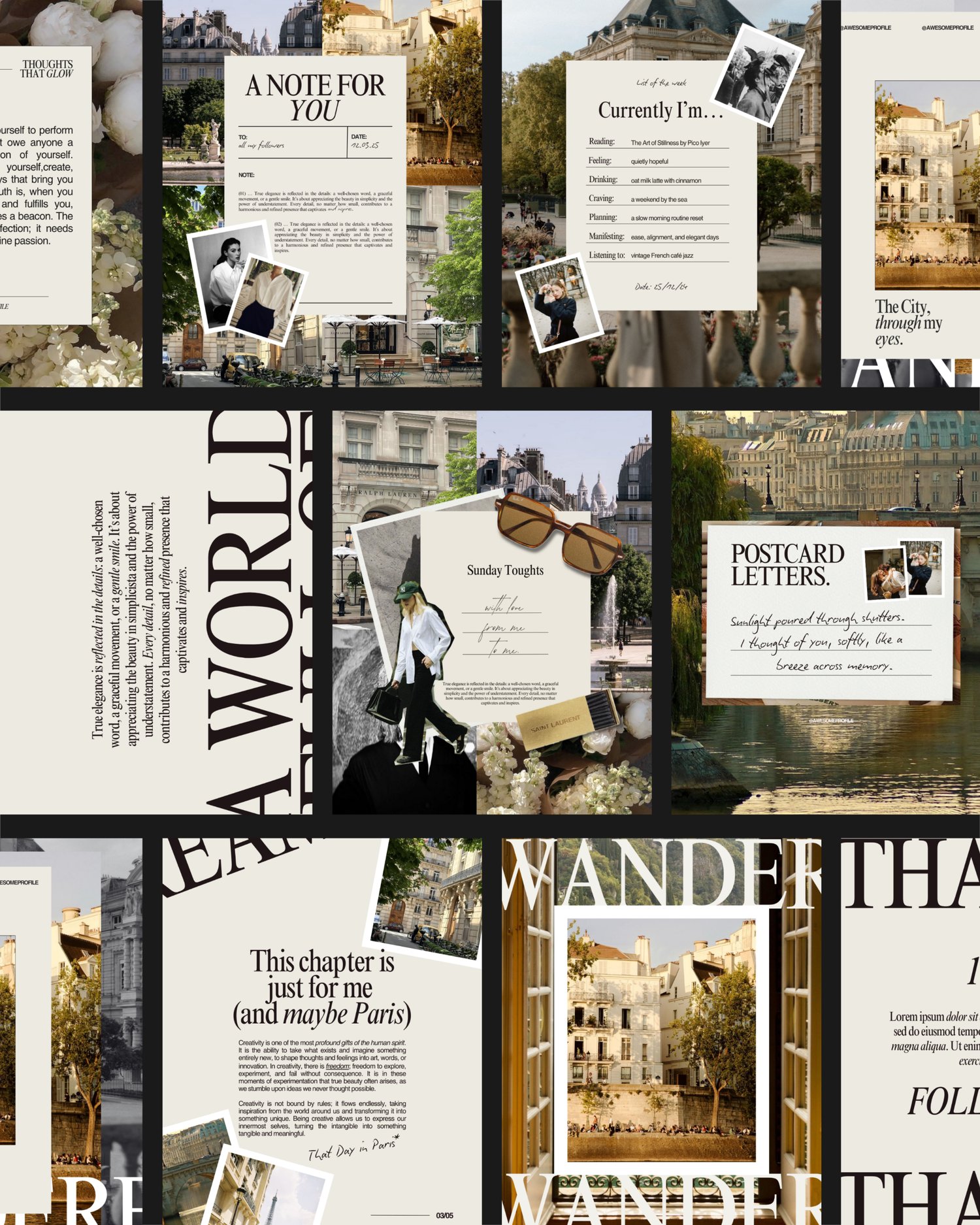 With a nostalgic and timeless aesthetic these templates evoke the quiet beauty of everyday life (handwritten notes, quotes, journal entries, and travel memories) all wrapped in a minimal yet soulful editorial style.