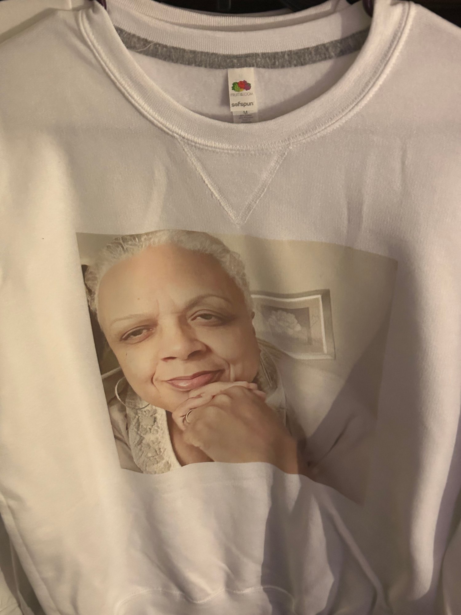 White sweatshirt which you can create by putting your own images to your liking. It comes in many different sizes and colors.