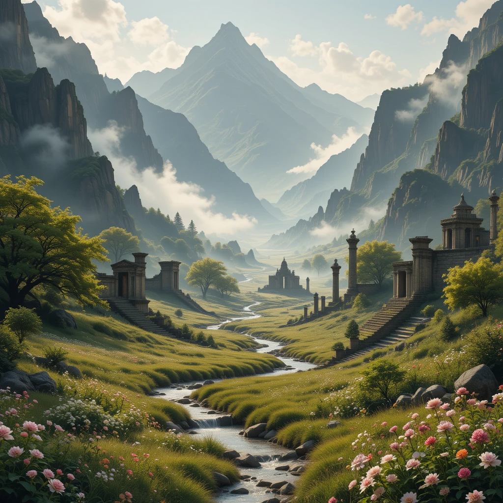 Step into the heart of Hallowed Valley, a hyper-realistic AI art print that showcases a serene, sacred valley surrounded by towering mountains and misty rivers. The ancient stone ruins and gentle light evoke a sense of timeless beauty, perfect for fans of spiritual and tranquil landscapes.