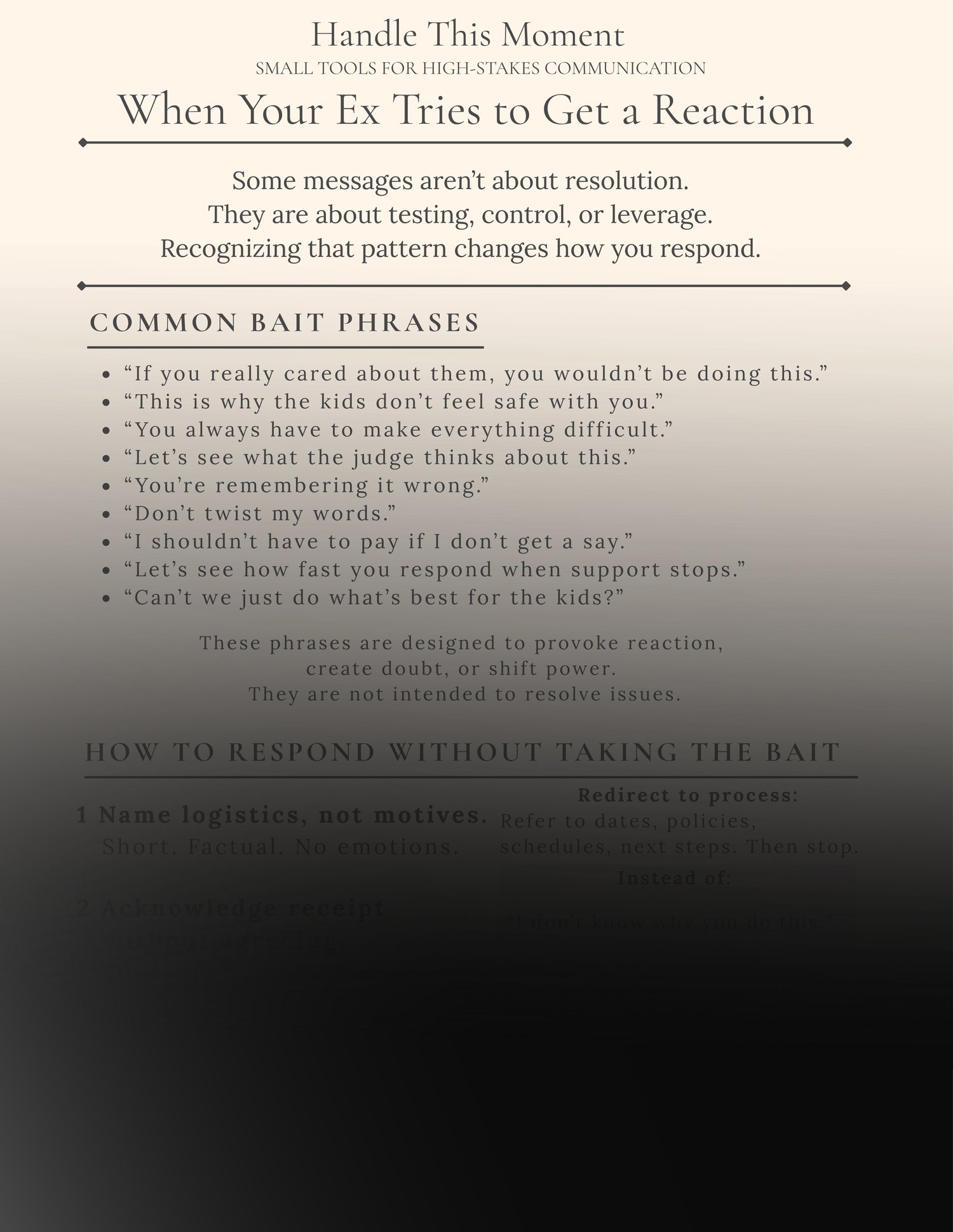 When Your Ex Tries to Get a Reaction: How to Respond Without Taking the Bait is a one-page tool that helps you recognize those moments and respond without escalating, over-explaining, or handing control to the other person.