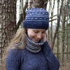 The Collection was designed such that you can knit both the cowl and hat using just two skeins of DK weight yarn. To do this, you will need to switch your main color between projects. This will create a coordinating set rather than a matching set.