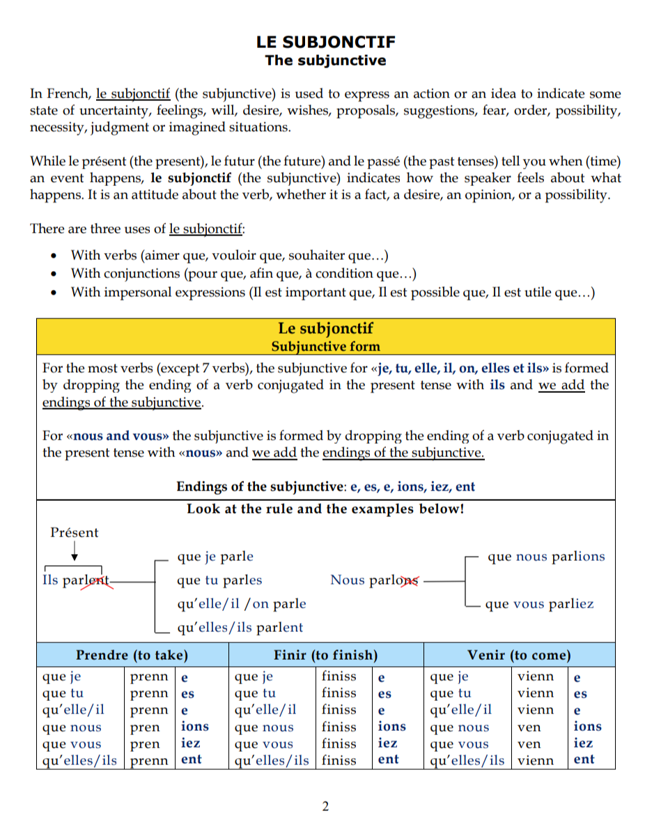 In this lesson, you learn or teach your students all you / they need to know about the French Subjunctive. You may want to have it as the explanation is clear, simple, and concise. It also comes with many examples, and three exercises followed by the correct answers for better assimilation. Moreover, to save time, this resource is in French and English for faster learning.
