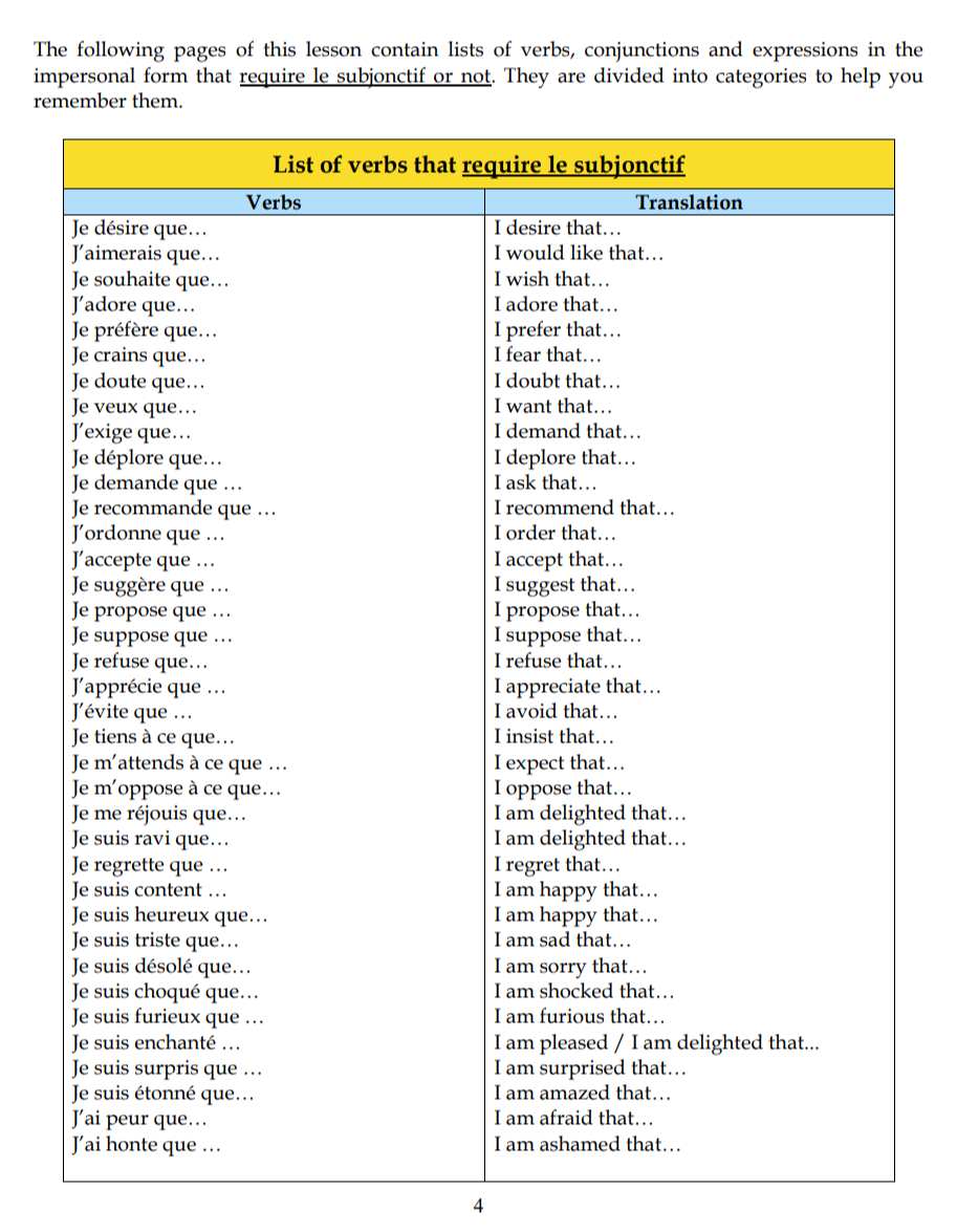 - List of verbs and expressions in the impersonal form that requires the subjunctive