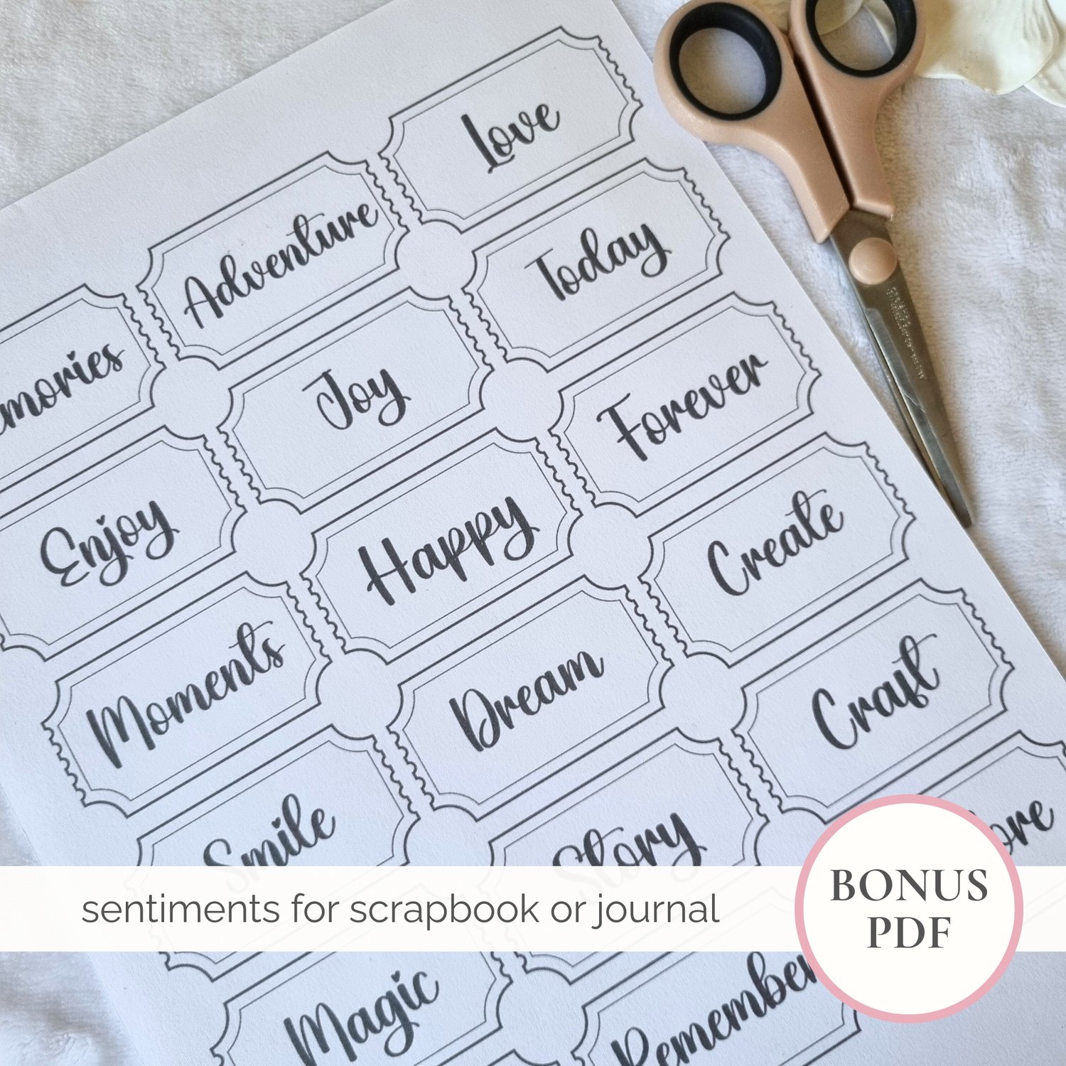 - BONUS PDF file with 18 scrapbook/journal embellishments (approx. 2.5 x 1 1/4 inches or 6 x 3.5 cm)