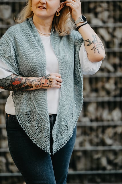 The gauge isn’t crucial on this project, but differences will affect the finished size as well as the required yardage, so I strongly recommend making a swatch and adjusting the needle size as necessary.