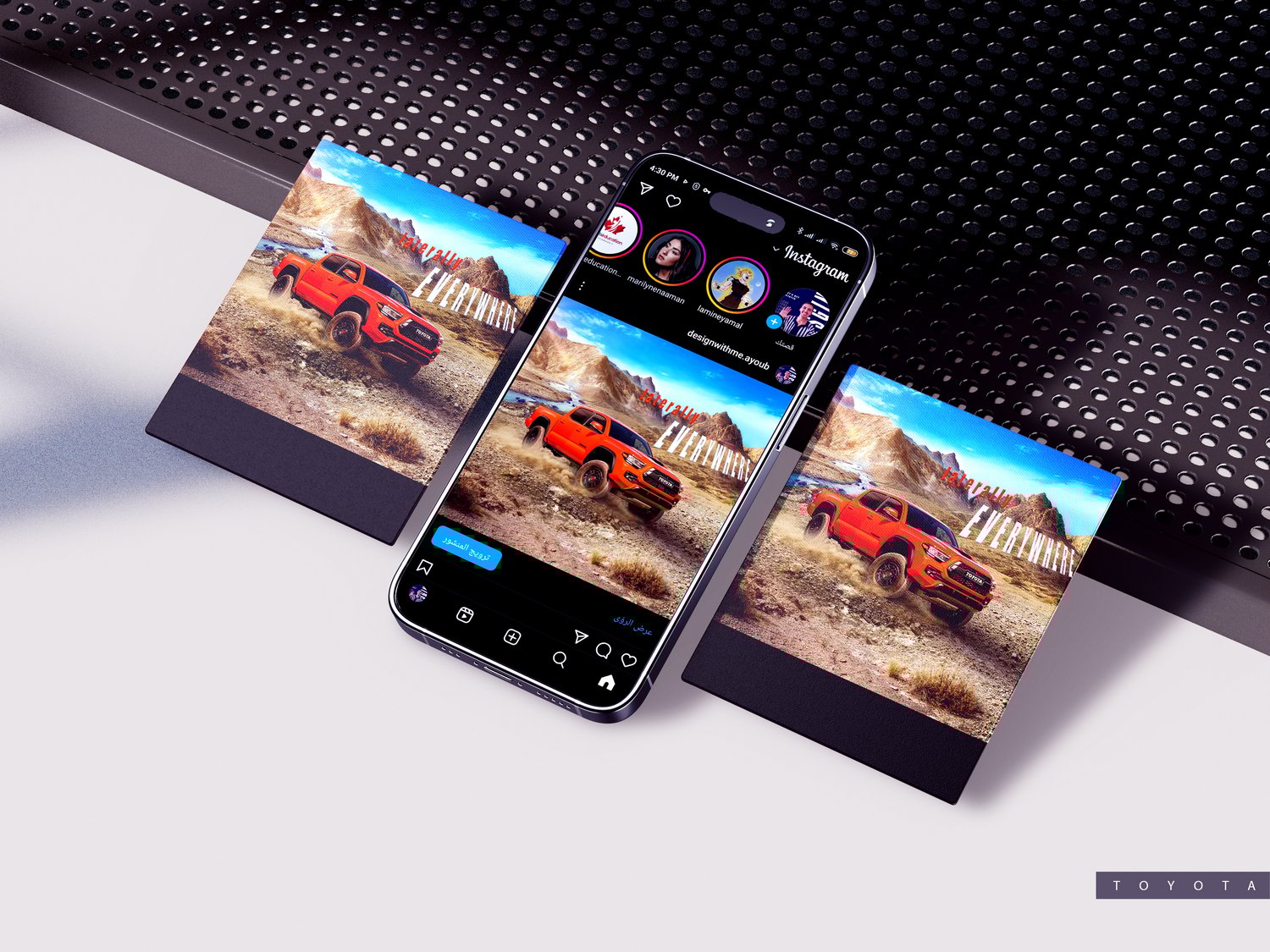 Unleash your brand’s strength with a design forged in the heart of the desert. This powerful visual captures a Toyota standing bold under scorching heat, surrounded by sand, rugged mountains, and a message of relentless endurance. Built for brands that want to be seen as unshakable, daring, and unstoppable.