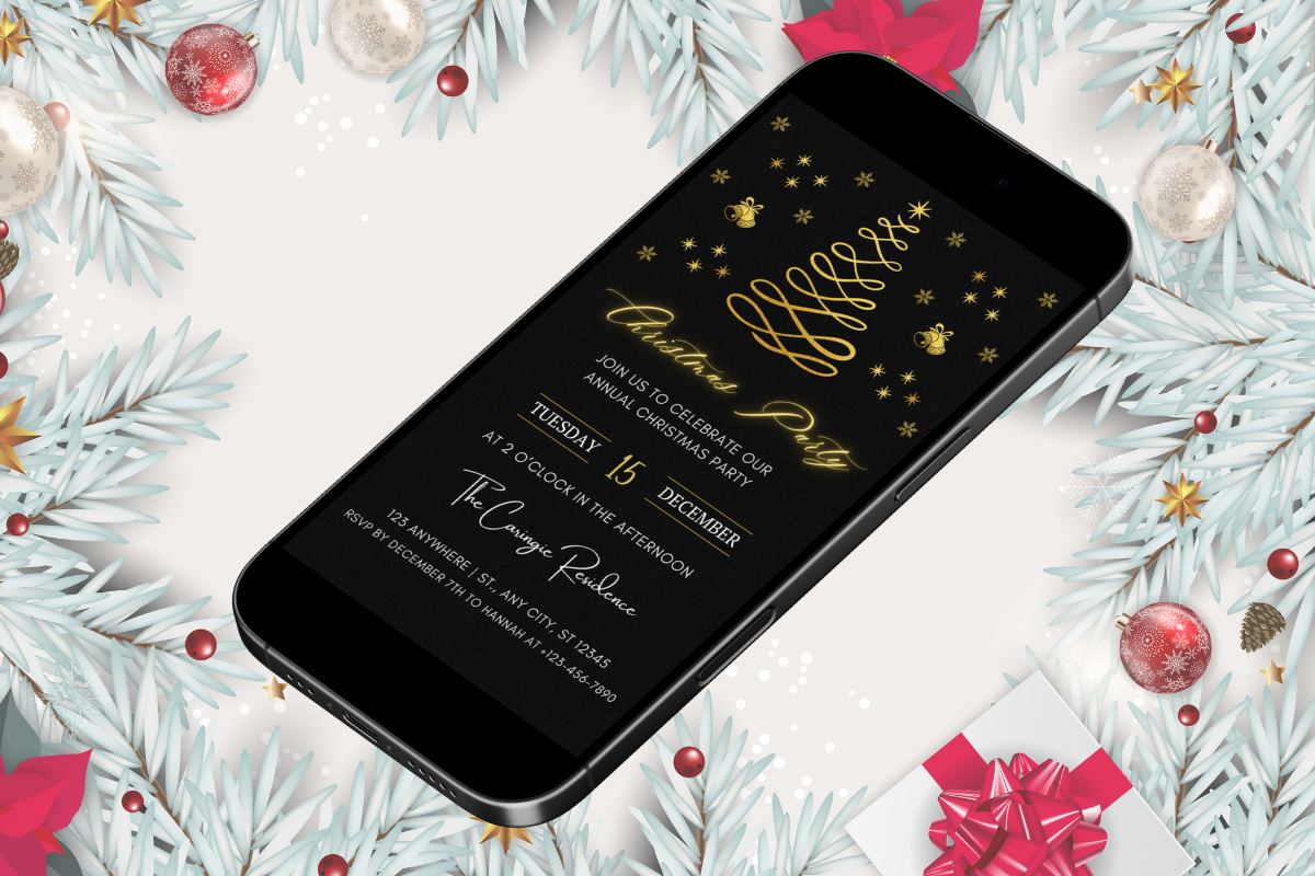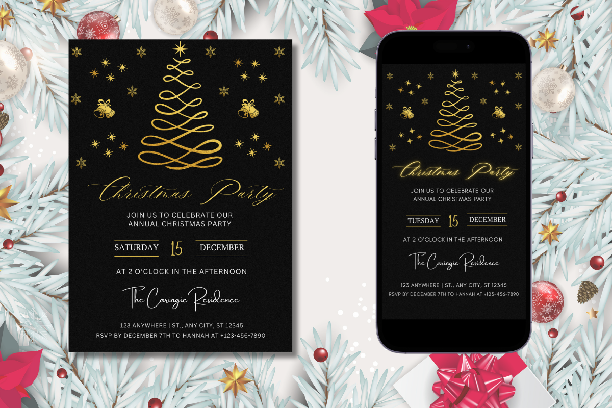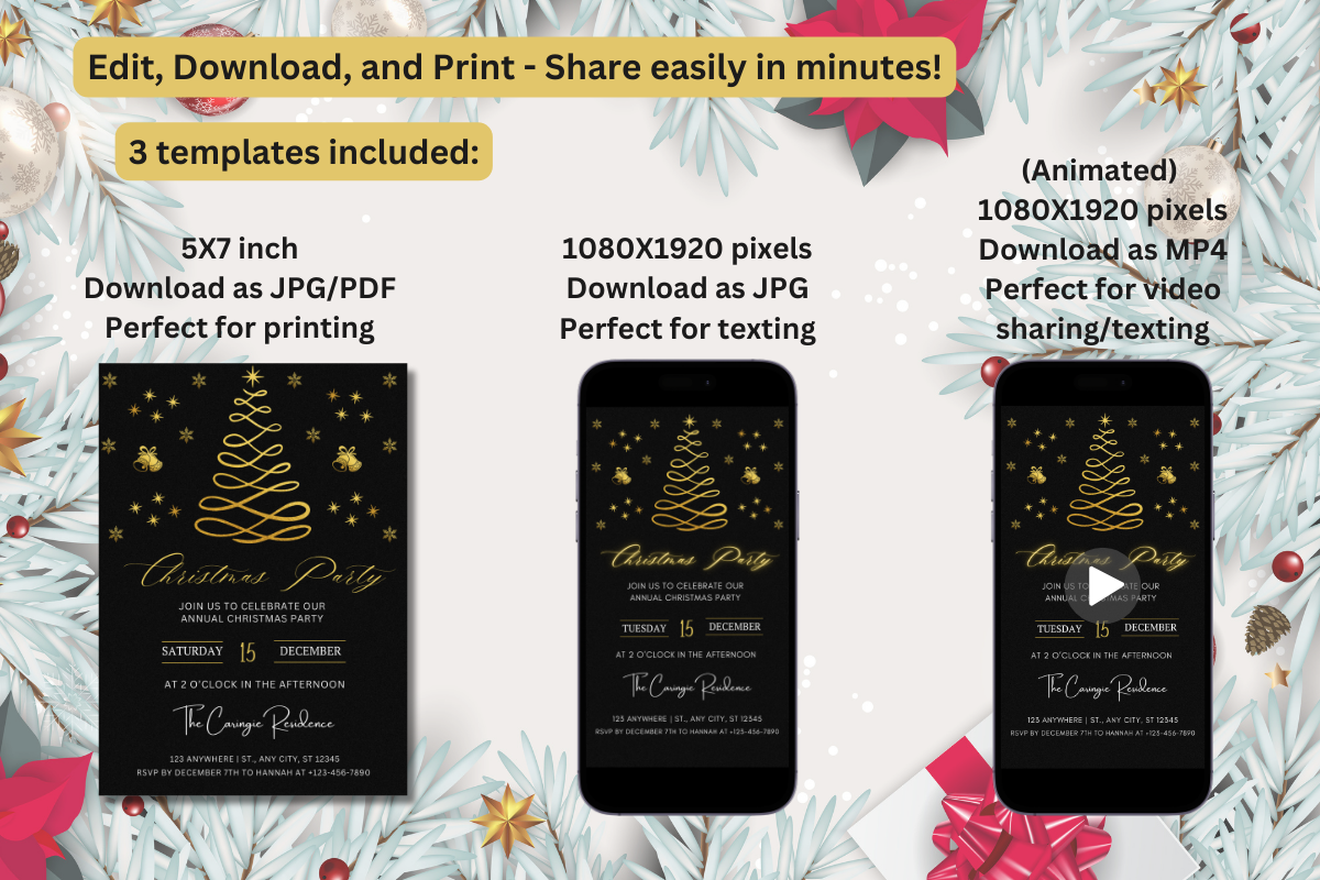 Editable Black and Gold Christmas Party Invitation Template, Holiday Party Invitation, Editable Christmas Tree Invitation, Printable, Digital E-Invite