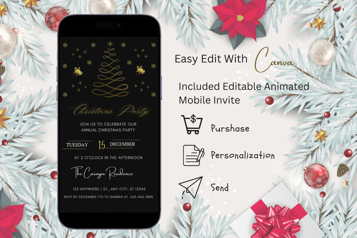 Editable Black and Gold Christmas Party Invitation Template, Holiday Party Invitation, Editable Christmas Tree Invitation, Printable, Digital E-Invite, Self Editable Template eCard, Digital E-Invite, Editable Canva Template - Invitation Canva Template - Lifetime Access.
