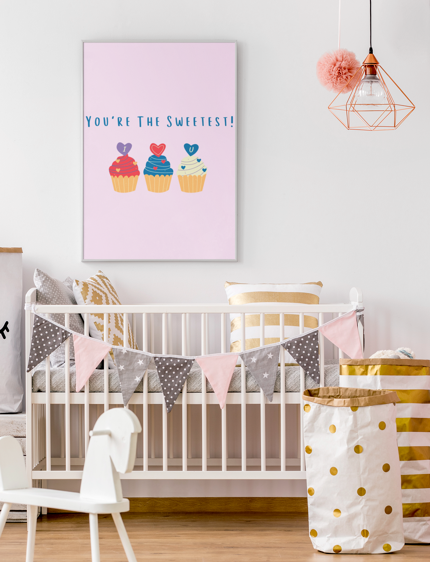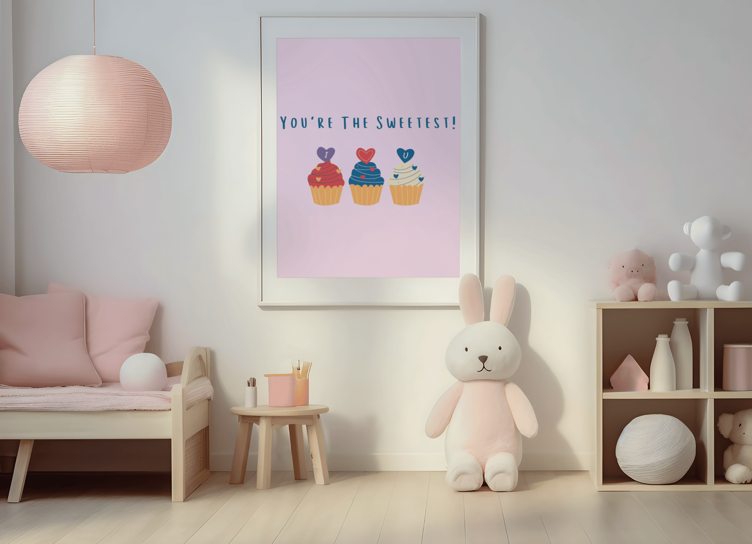 Three cupcakes and a sugary pink palette make this a darling print for your little sweetie..