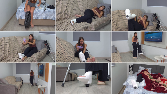 - Gehen an Krücken, Lernen, Interaktion mit dem Gipsverband, Zehenwackeln, Nahaufnahmen des Gipsverbandes, Vorführen von Turnschuhen mit Gipsverband und Anschauen von Videos auf einem Handy, während man den Gipsverband vorführt.