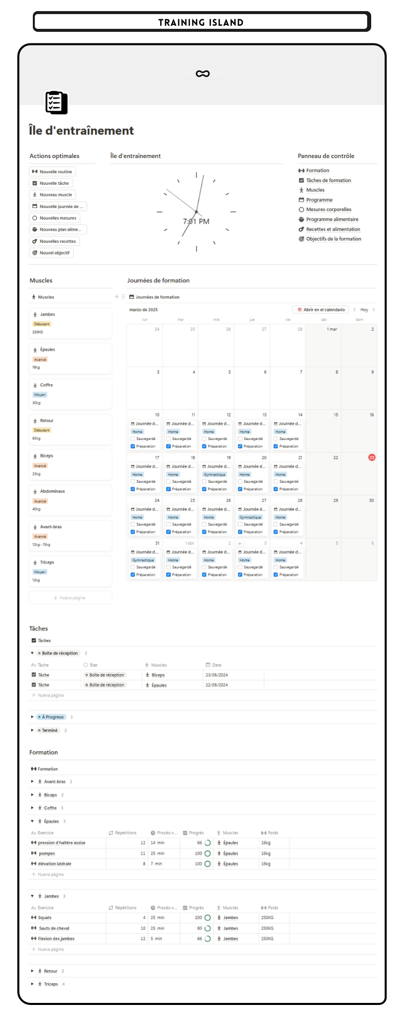 Si tu t'entraînes sans plan clair, il est facile de perdre le focus et de ne pas voir de résultats. Île d’Entraînement est ton espace dans Notion pour organiser, suivre et améliorer ta routine d'exercices sans complications.