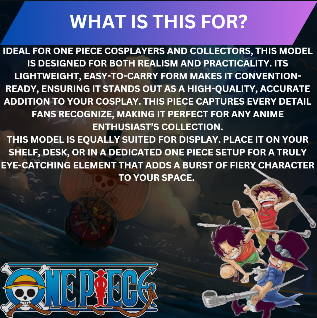 This is a fan-made 3D model inspired by One Piece. I do not own the rights to One Piece, which belongs to Eiichiro Oda, Toei Animation, Shueisha, and their respective licensors. This model is for personal use only and is not intended for commercial use, resale, or mass production. Please support the official release.
