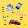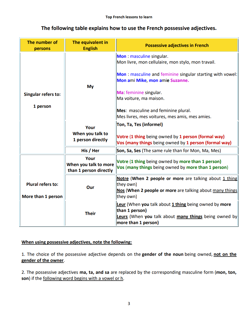 - The French possessive adjectives (ma, mon, mes, ta, ton, tes, son, sa, ses, votre, vos, notre, nos, leur & leurs.)