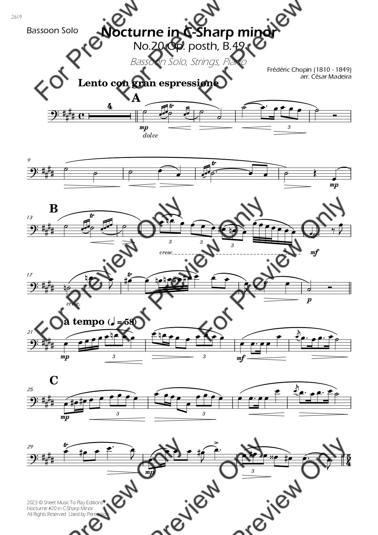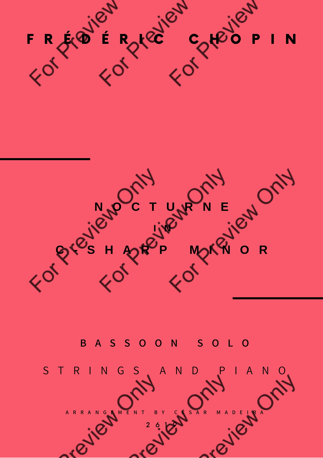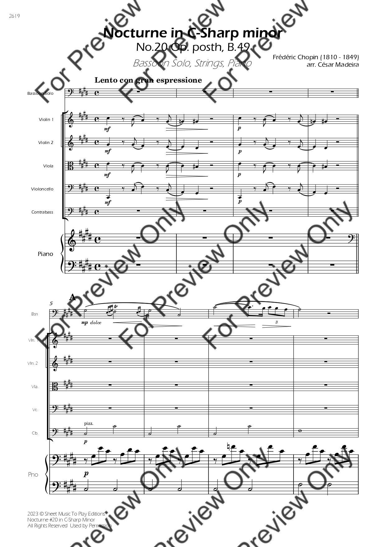 Nocturne No.20 in C-Sharp minor by Frederic Chopin. Arrangement for Bassoon, Strings and Piano. With Full Score and Individual Parts. Have fun!