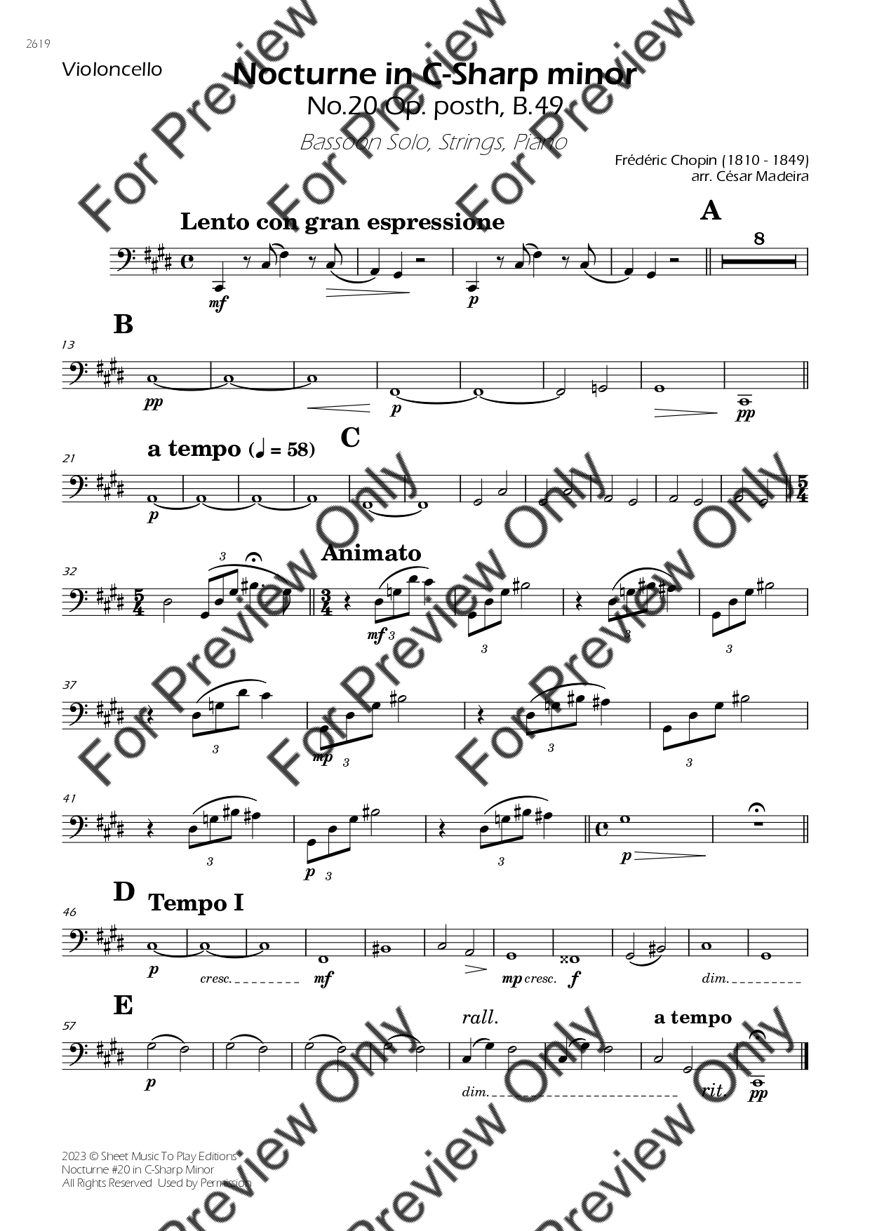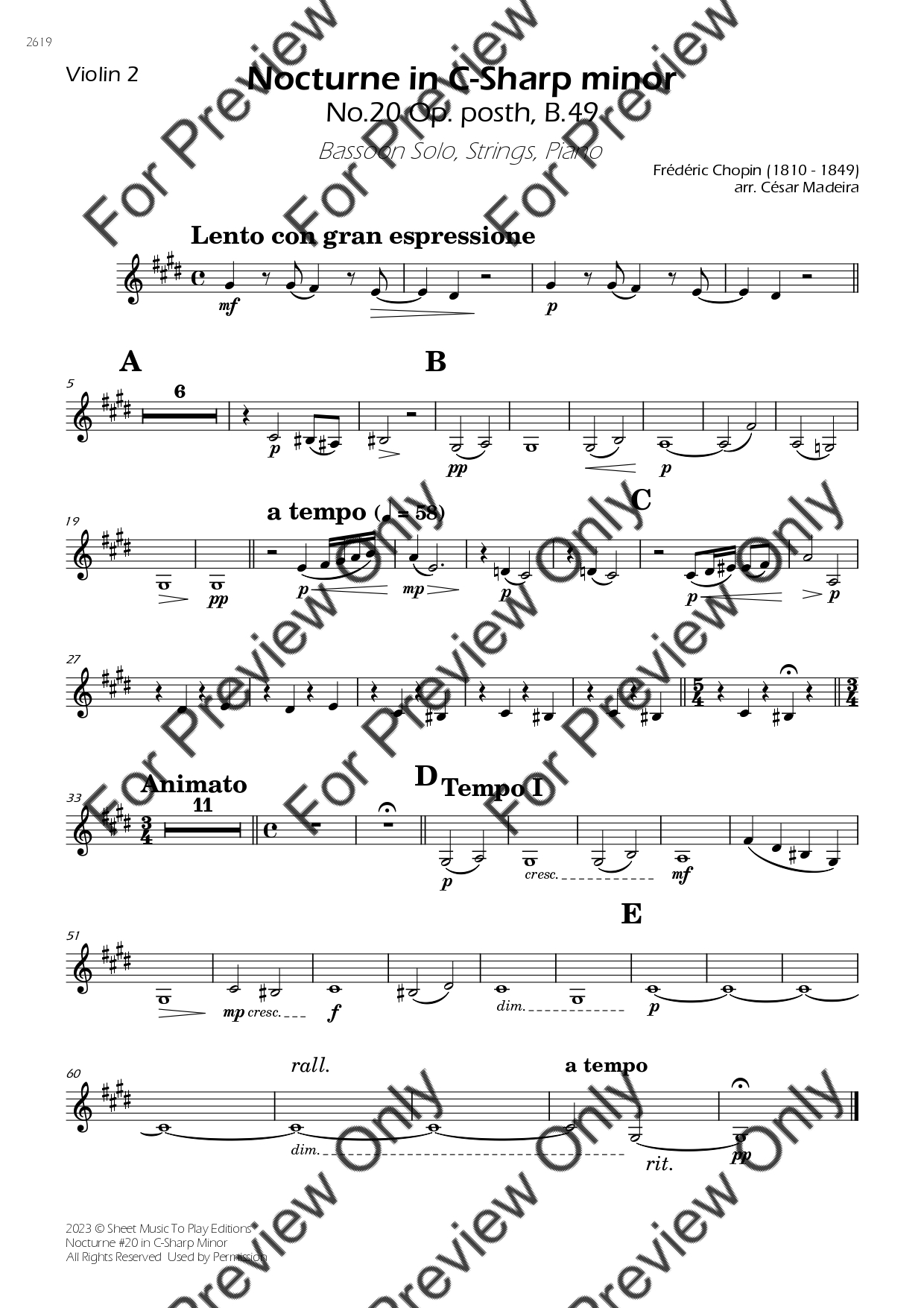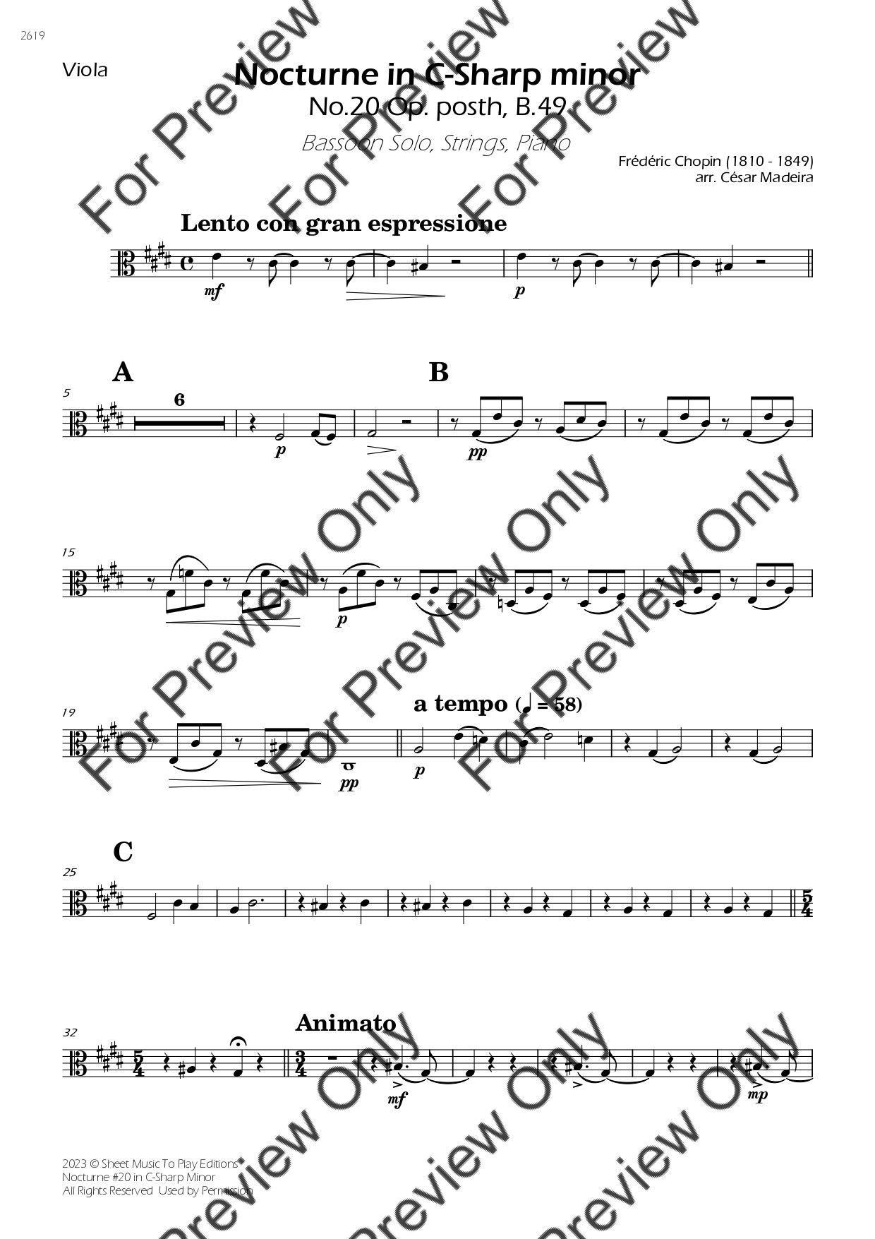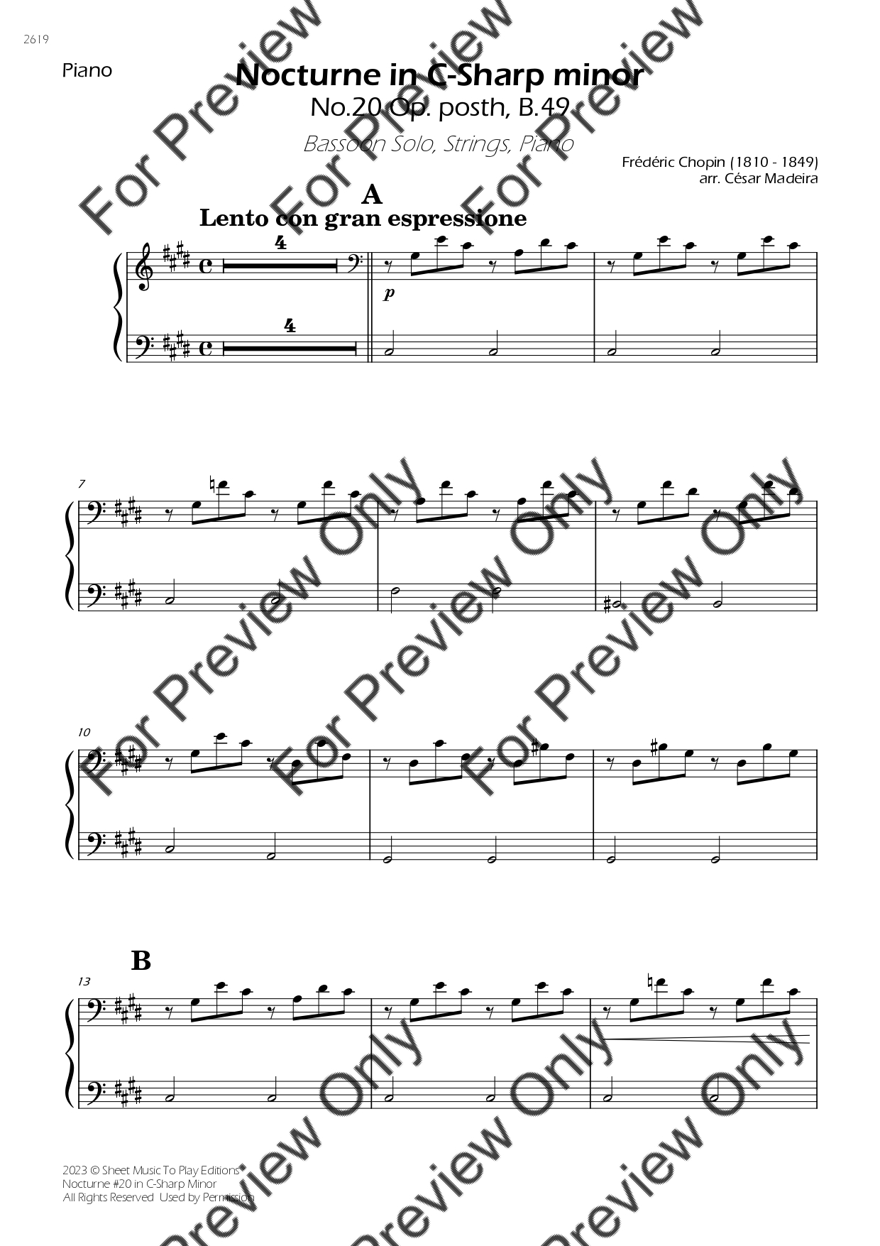 Nocturne No.20 in C-Sharp minor by Frederic Chopin. Arrangement for Bassoon, Strings and Piano. With Full Score and Individual Parts. Have fun!