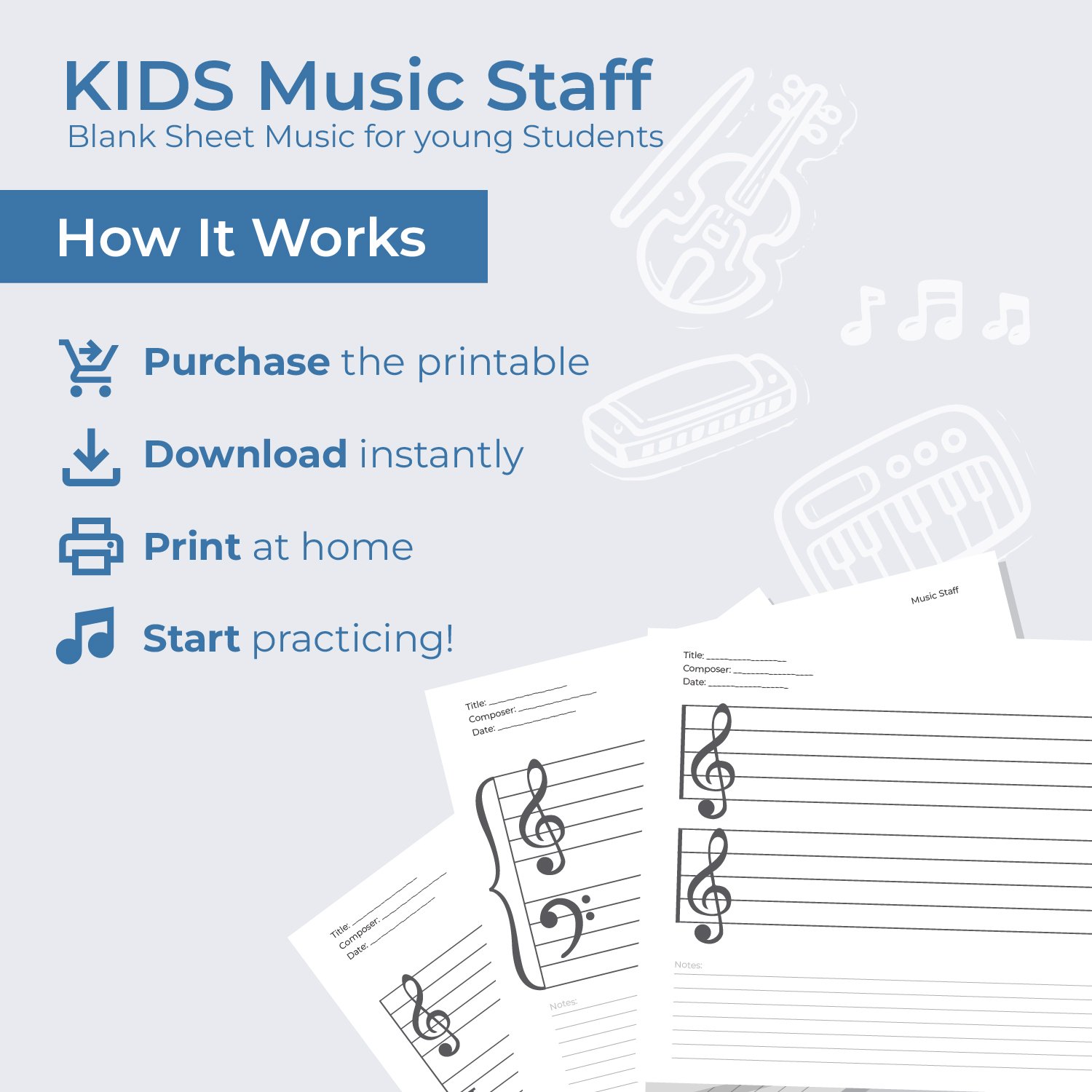 Music Staff Paper for Kids | Large Print Manuscript Paper Bundle | Beginner Music Writing Sheets | Piano, Treble, Bass & Guitar | Printable PDF | Instant Download