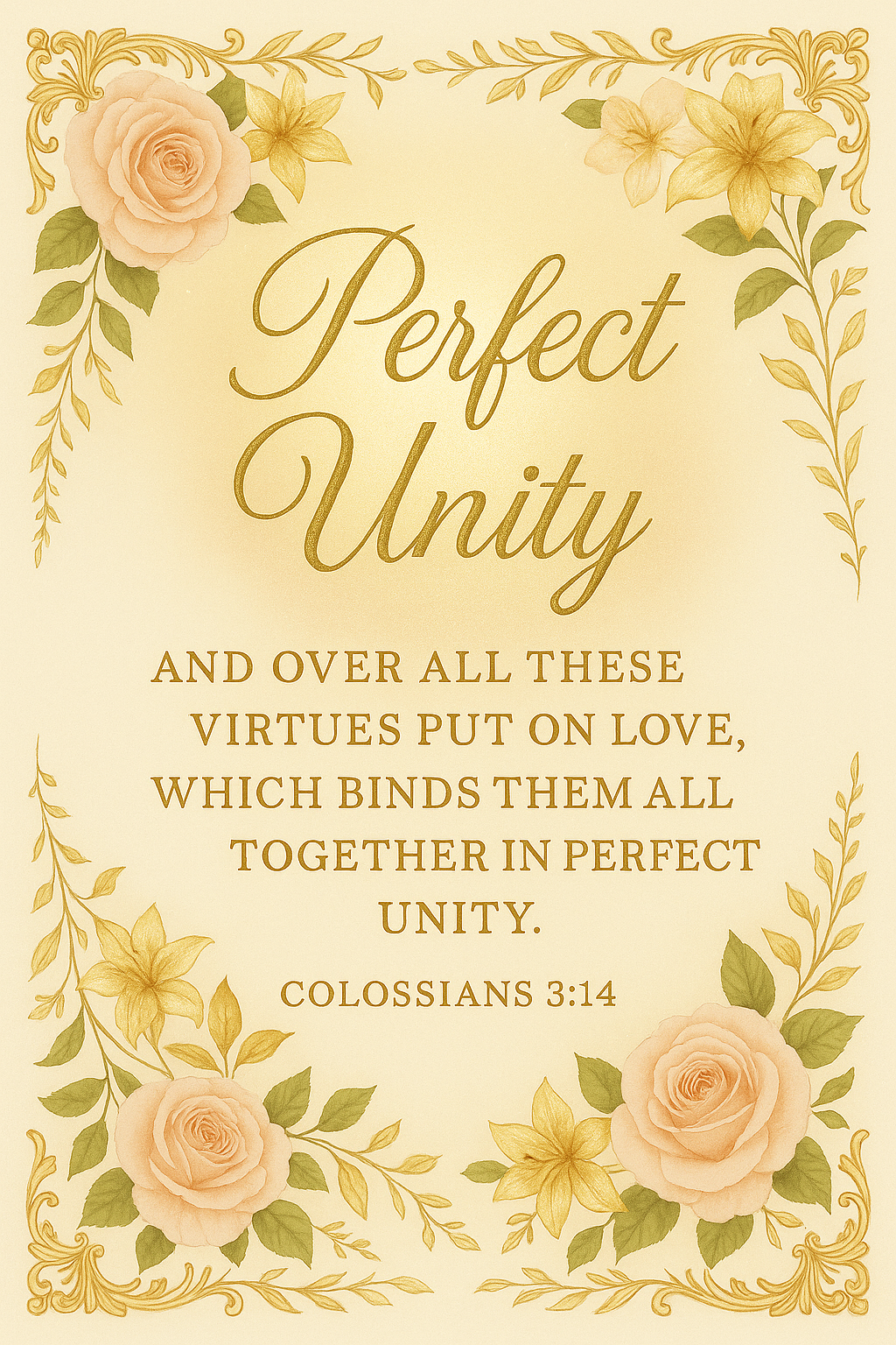 Celebrate divine harmony with this Christian wall art featuring Colossians 3:14. Designed with soft peach and yellow roses, white lilies, and golden scrollwork on a cream background, this printable affirms that love binds all virtues in perfect unity. Ideal for weddings, ministry kits, and devotional spaces.