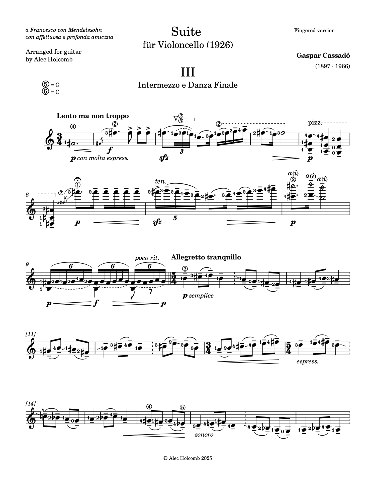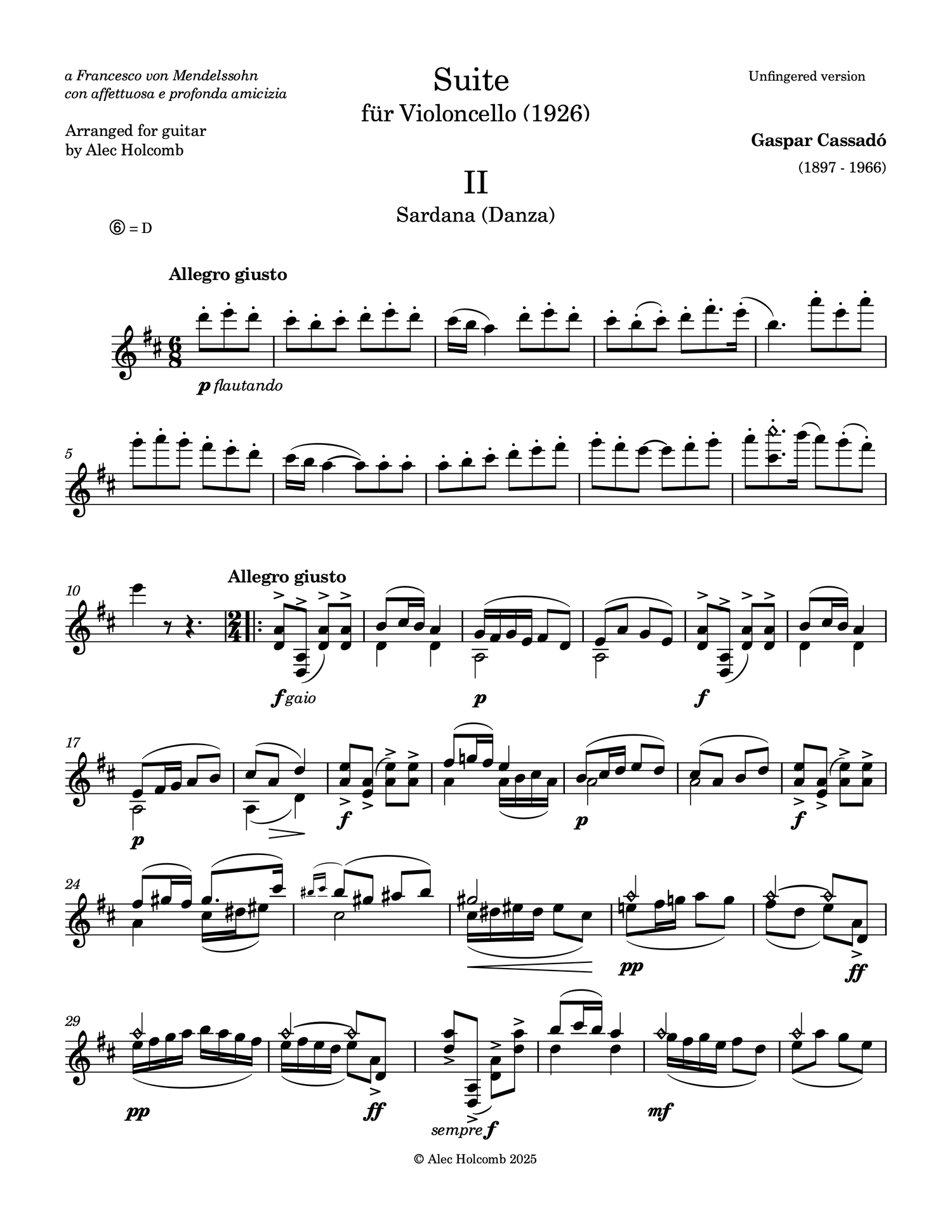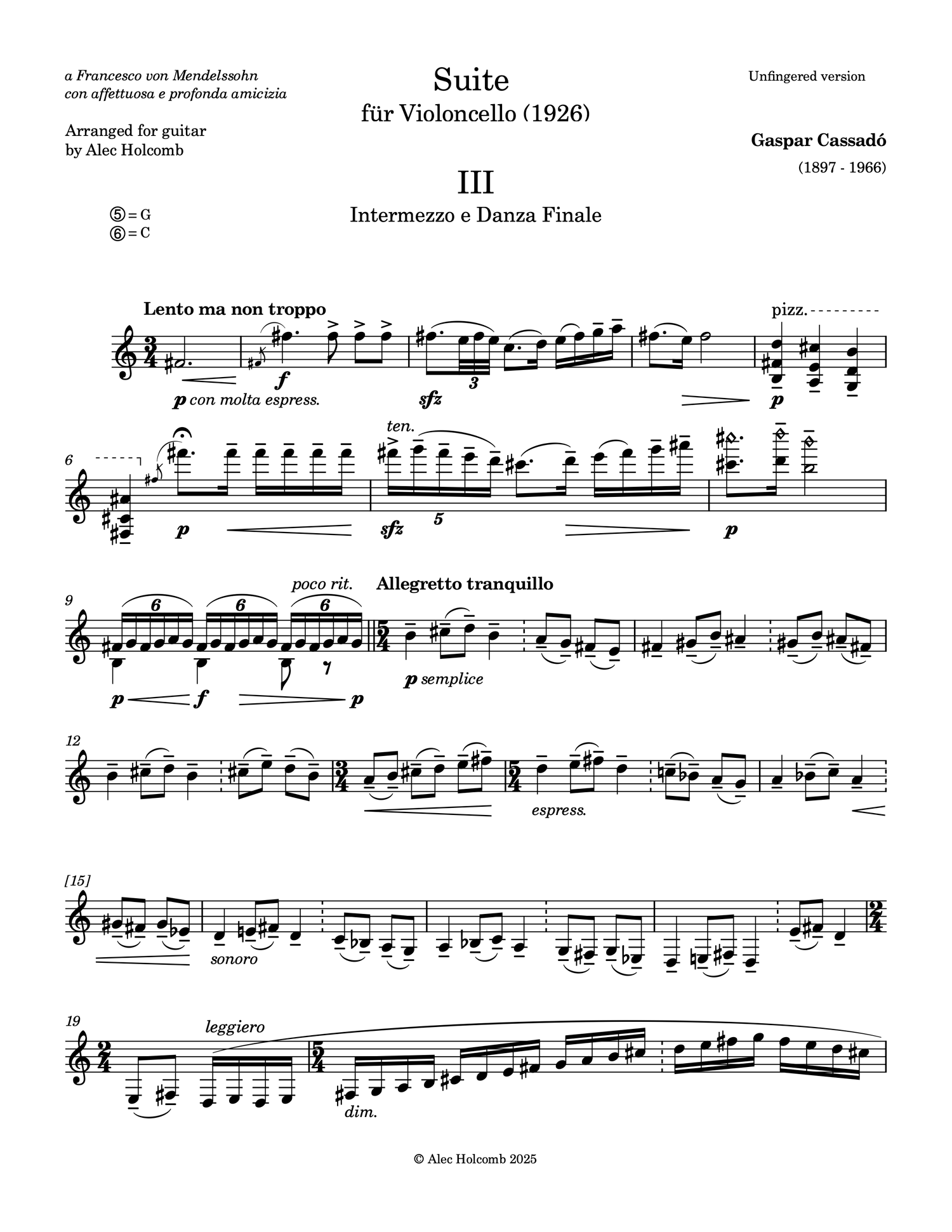 One thought that's popped into my head frequently while playing this piece is finding a balance between three elements. These elements are the music itself, the characteristics of the cello as an instrument, and the characteristics of the guitar. When does it feel like Cassadó was writing for the sonic qualities of and physical limitations of the cello? When does the music feel like Cassadó was imitating another instrument, such as the guitar? What kind of unexpected results can the guitar's natural sound have on this music, in both pure and traditional ways? Anyway, if you do play this piece, I'd love to hear what kind of stuff bubbles up for you.