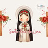 1x Ilustración completa con fondo: La imagen principal de Santa Rosa de Lima con un sutil fondo decorativo, lista para imprimir o usar en redes sociales.