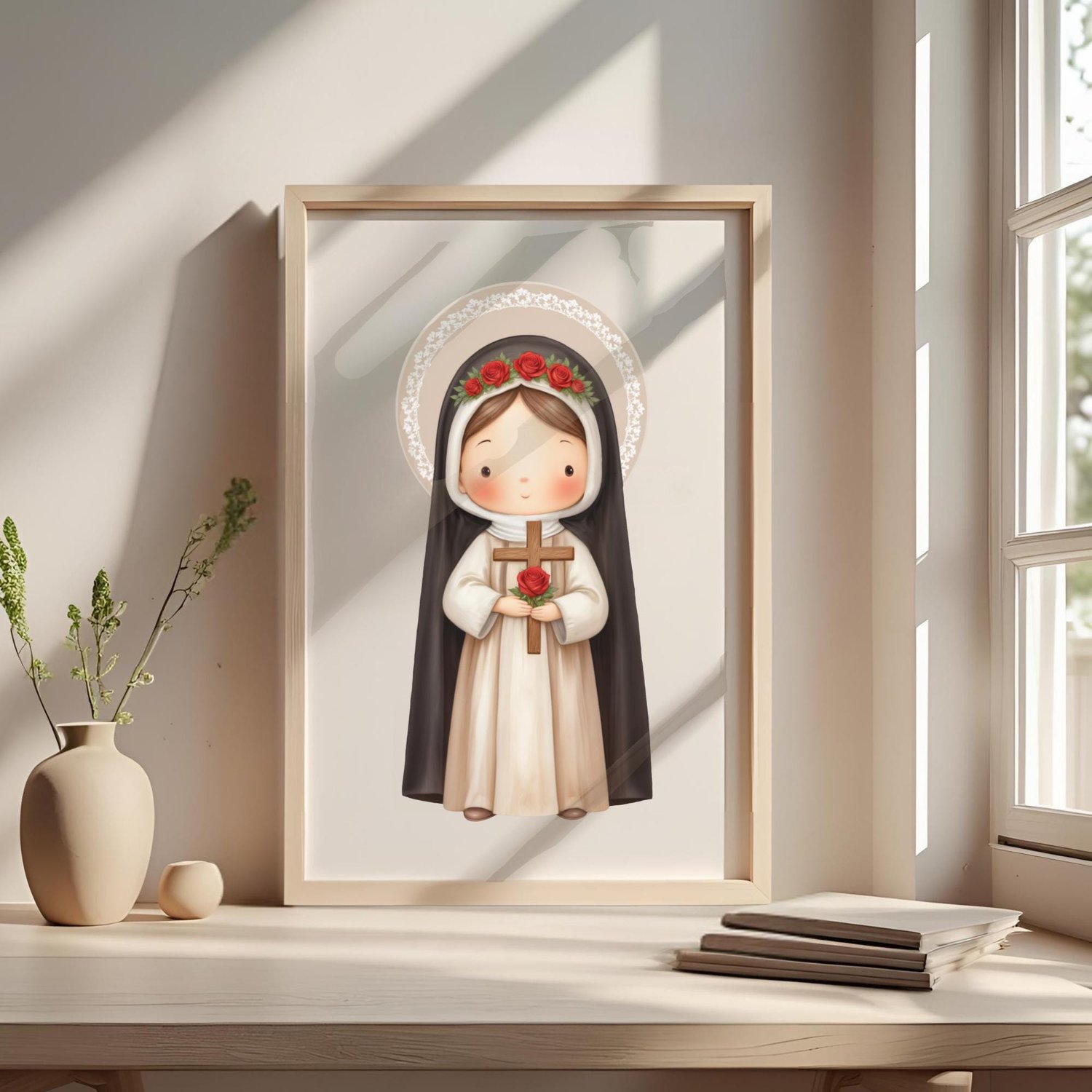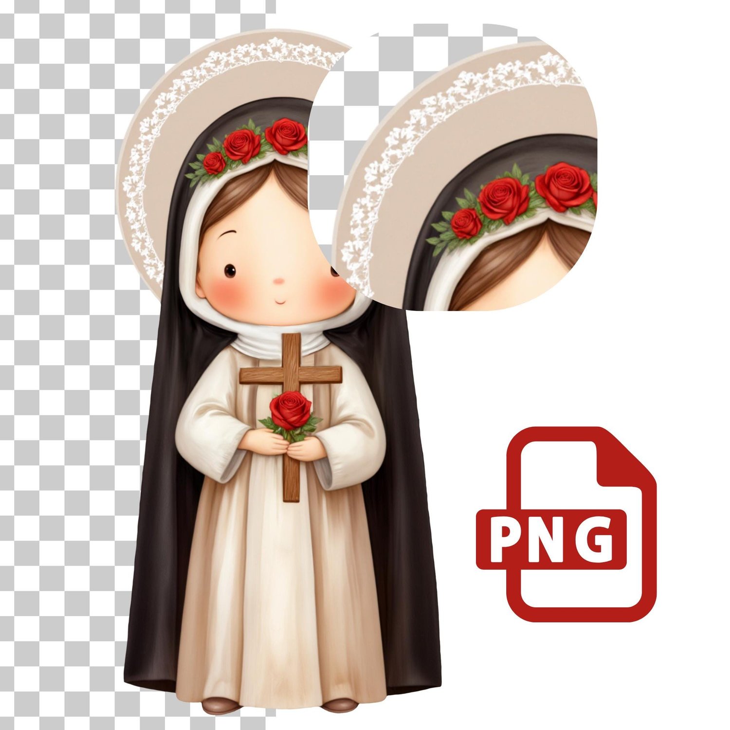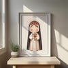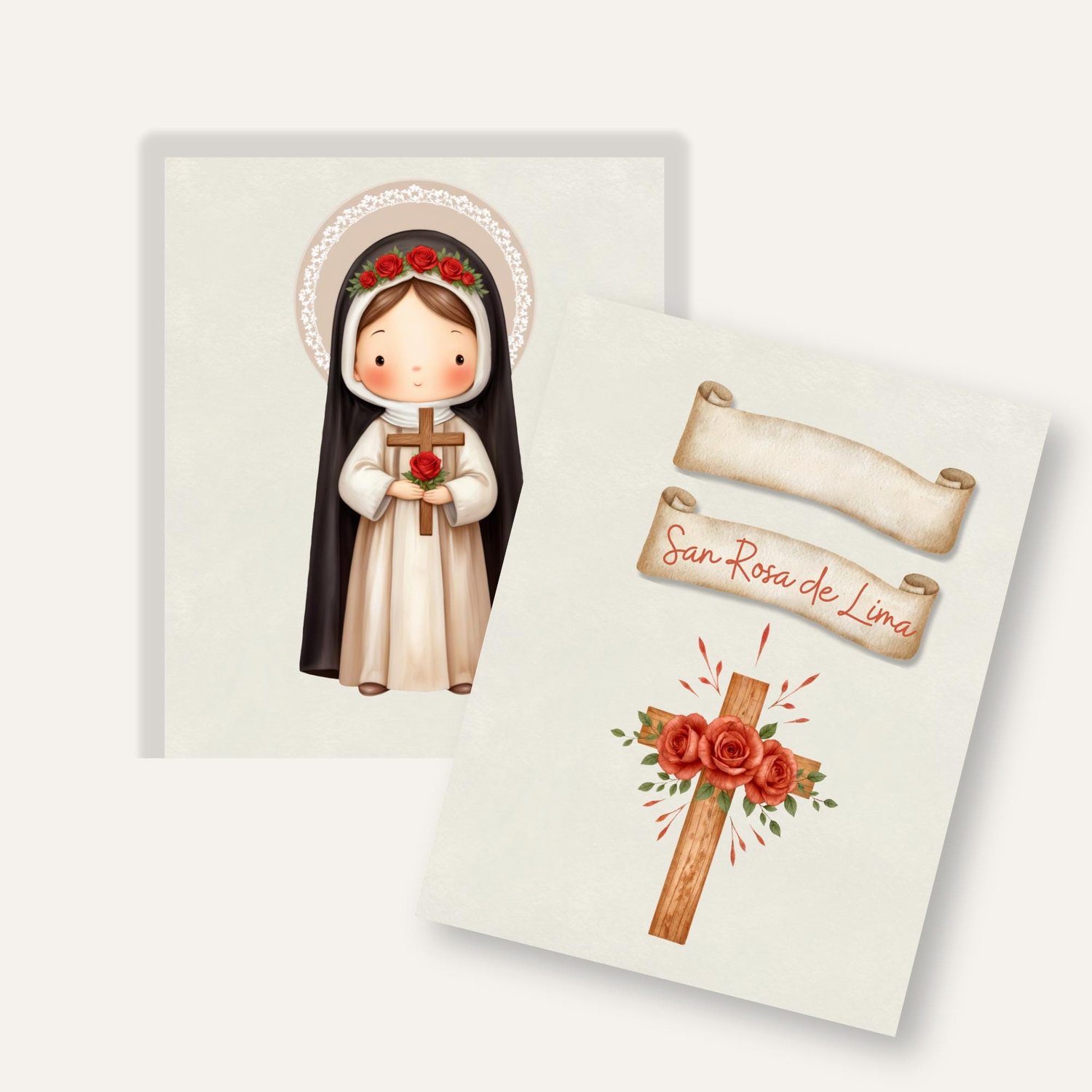 1x Ilustración principal de Santa Rosa de Lima: Una imagen completa de la santa, a menudo representada con una corona de espinas o rosas, en un estilo dulce y moderno. Ideal para estampitas, oraciones, recordatorios y más.
