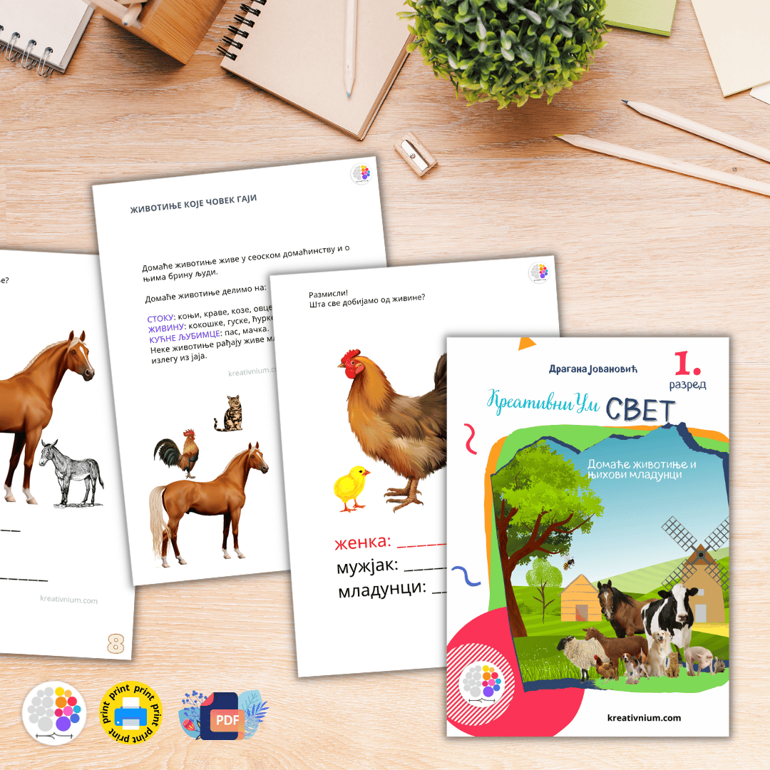 Ovaj komplet je dizajniran za uzrast od 7+ godina i uključuje 27 stranica za štampanje. Odlična je kućna aktivnost za decu koja mogu da nauče najvažnije o životinjama koje čovek gaji i njihovim mladuncima. Može se koristiti kao istraživačka aktivnost u učionici, za učenike prvog i drugog razreda. Dopunjena je slikama različitih domaćih životinja, tako da dete može da ih izreže i napravi fleš kartice za igru.